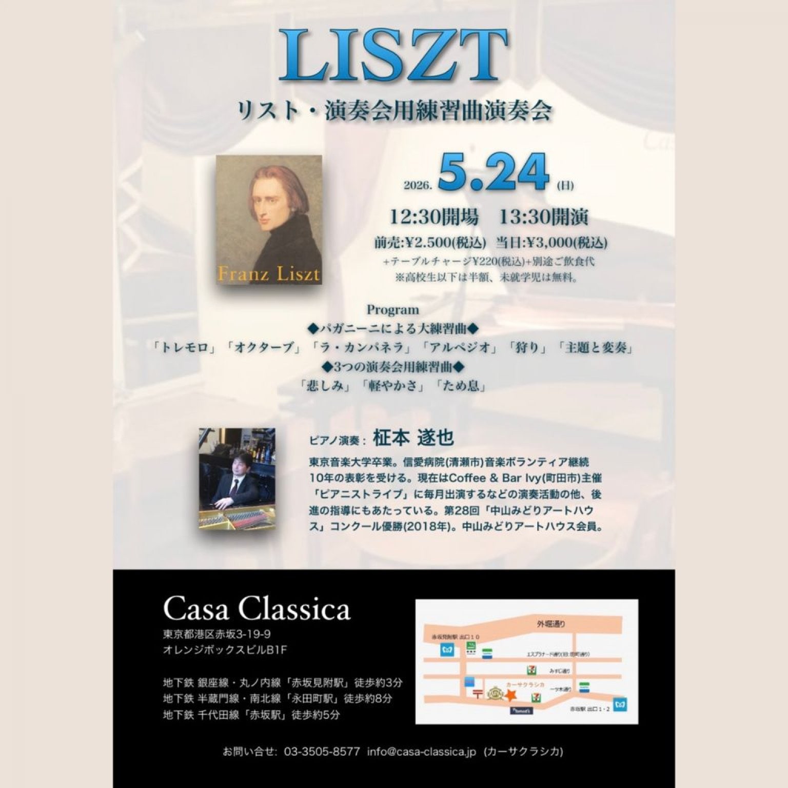 演奏予定曲目:リスト作曲「ラ・カンパネラ」「ため息」他