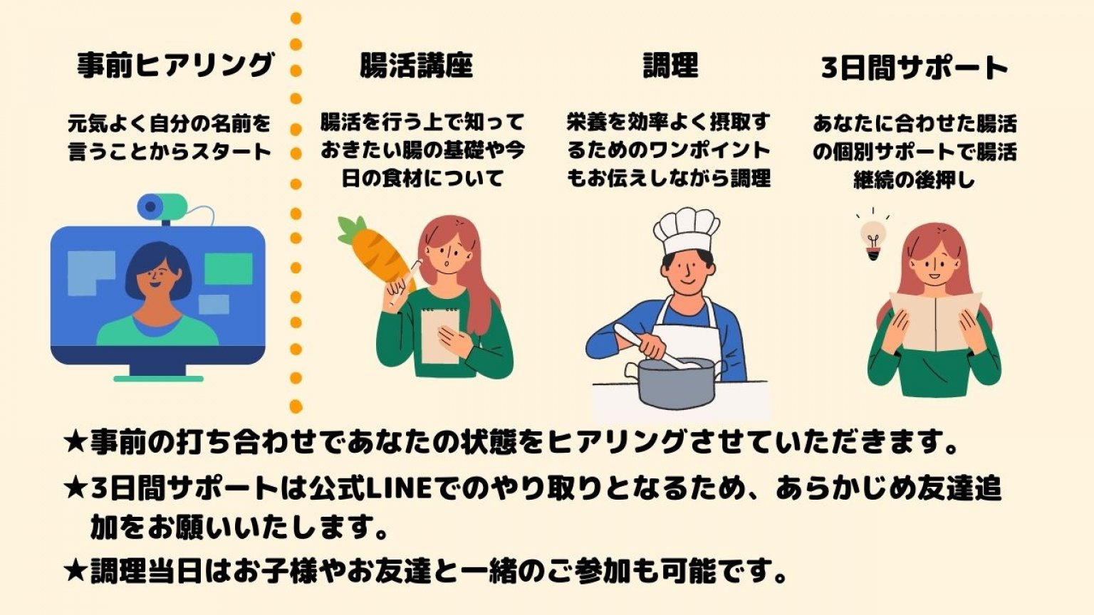 料理初心者の方でも簡単にできる、腸活講座と3日間腸活サポート付き料理教室のチケットです。