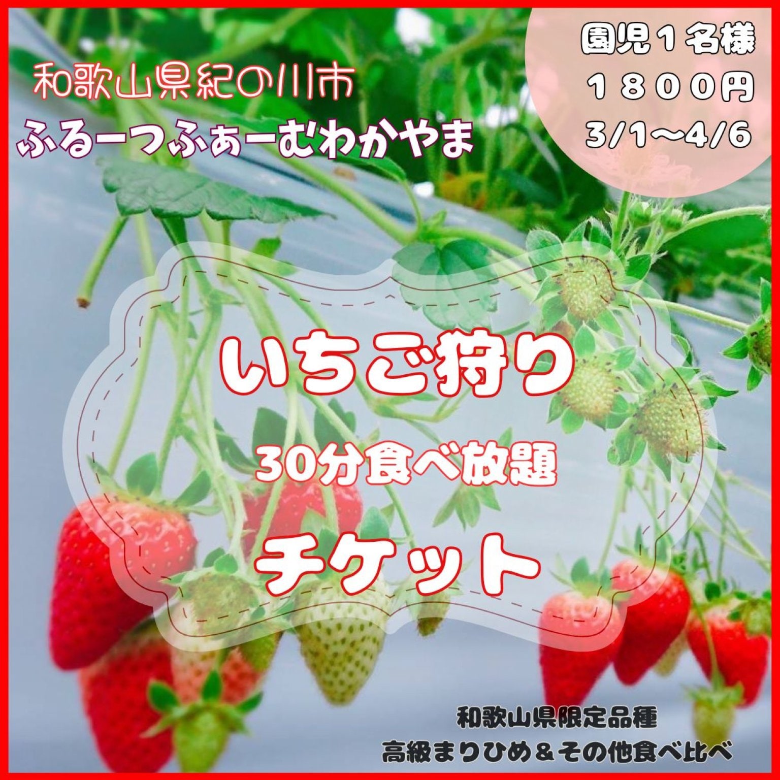 【いちご狩り30分食べ放題コース・園児(3〜5歳)用チケット♪】\*高級まりひめ&その他食べ比べ!*/《いちご狩り*30分*食べ放題》6品種育ててます♪カフェも併設♪<【和歌山県】ファミリー・カップル・女性にもおすすめ♪>2026年3月1日〜2026年4月6日までのプラン