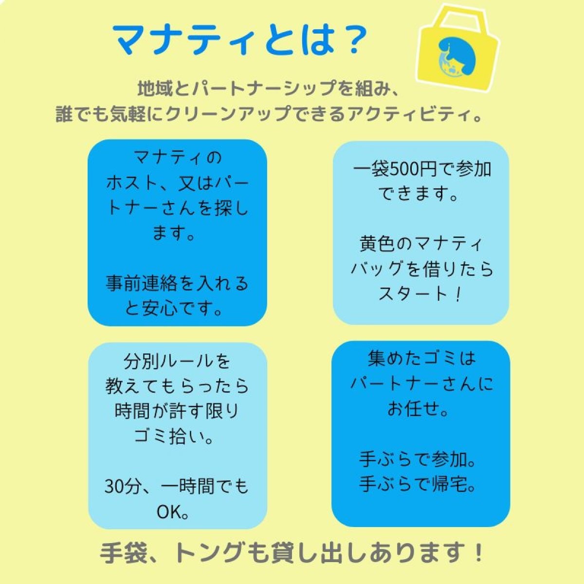 お近くの受付場所をお選びください。待ち合わせをしてお支払いの手続きをした後、マナティバッグ、手袋、トングをお貸しします。
