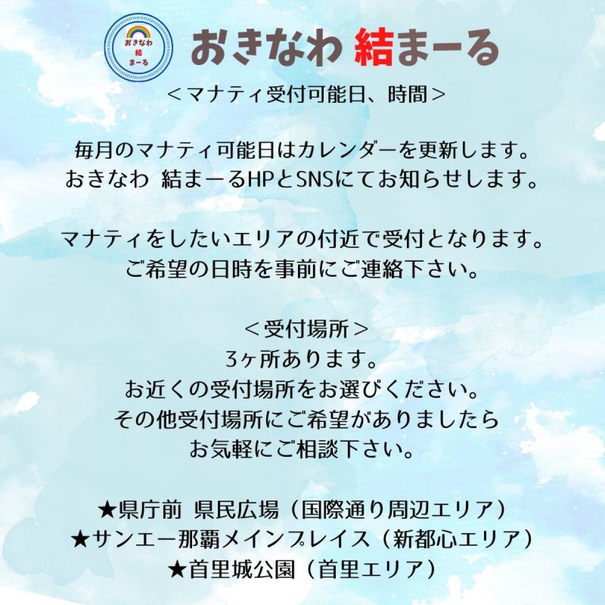 事前にお電話にて受付場所、日時を確認させていただきましてマナティ予約完了とさせていただきます。