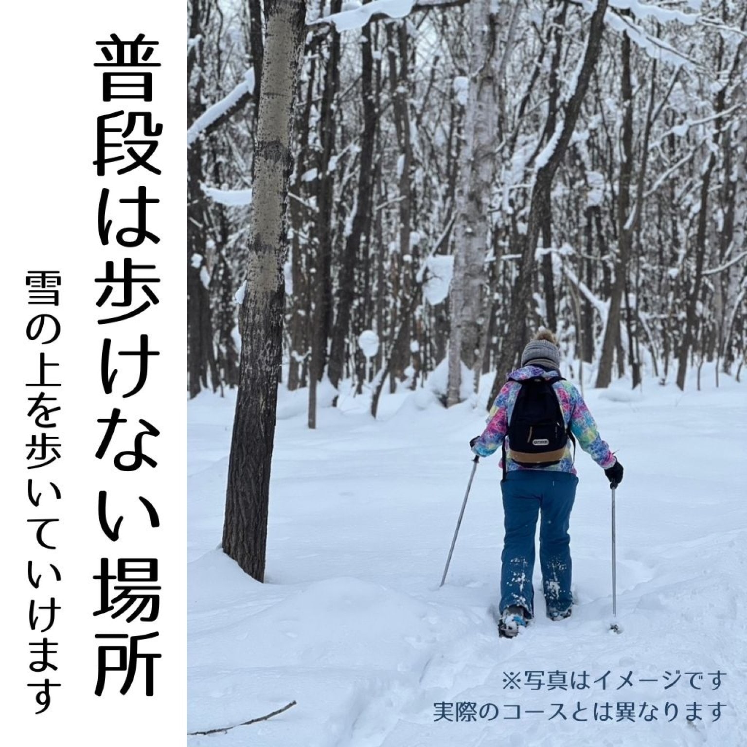 足跡のない雪原へ。冬の静寂を独り占めするスノーシュー体験当ツアーのハイライトは、「足跡が一切ない」純粋な雪原を歩く体験です。