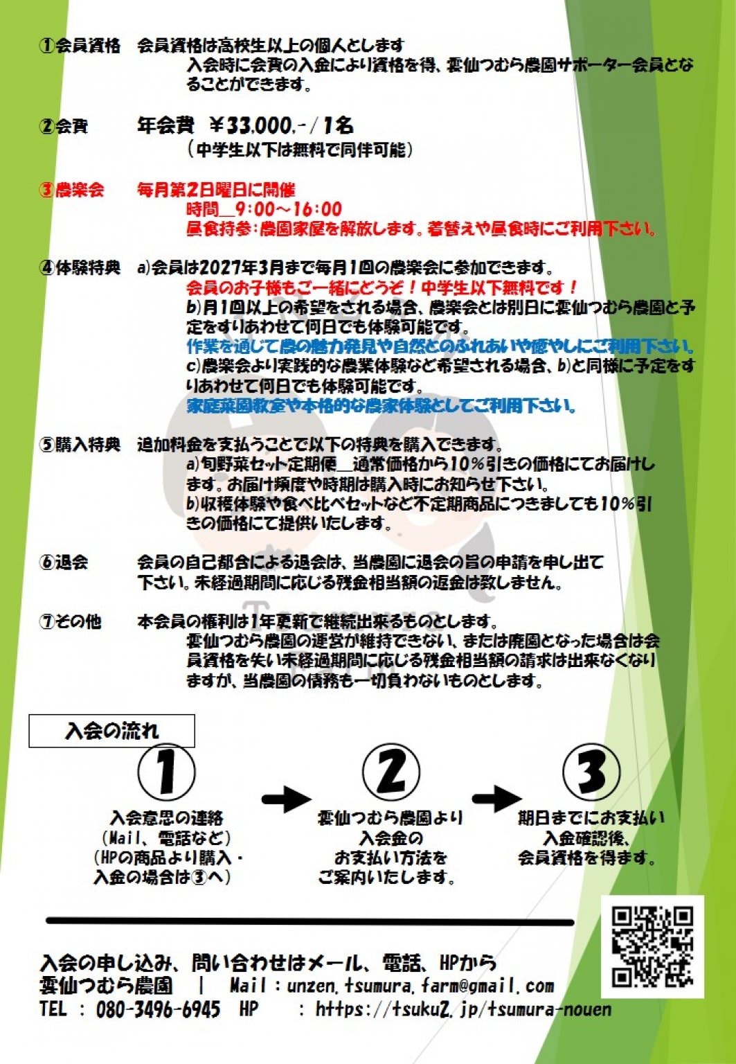 ④体験特典 a)会員は2027年3月まで毎月1回の農楽会に参加できます。