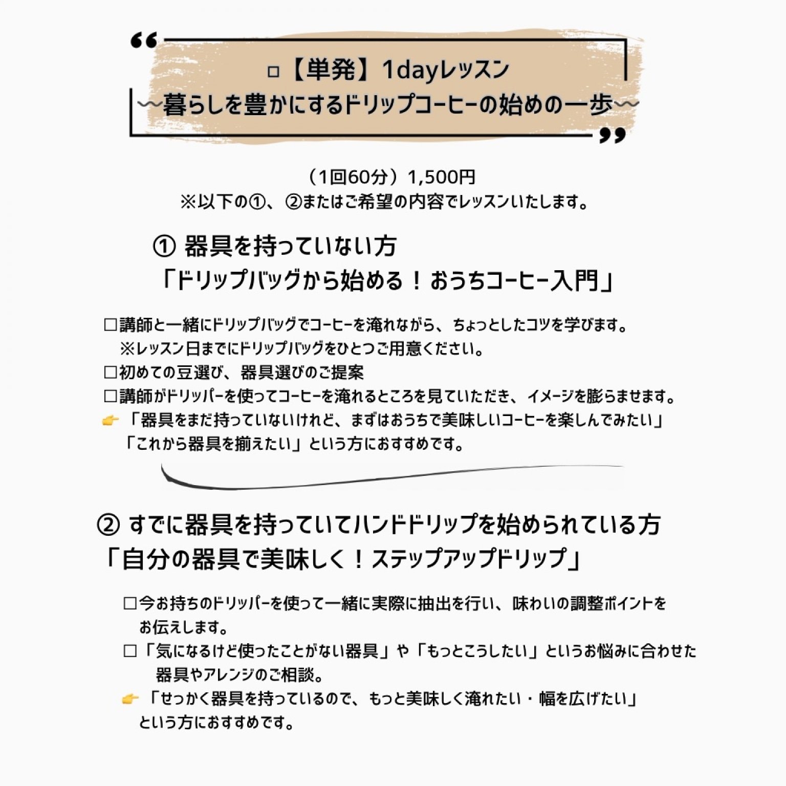②の内容をご希望の方は、いつも使っている器具と1杯分のコーヒー、コーヒーを淹れることができる環境をご準備ください。