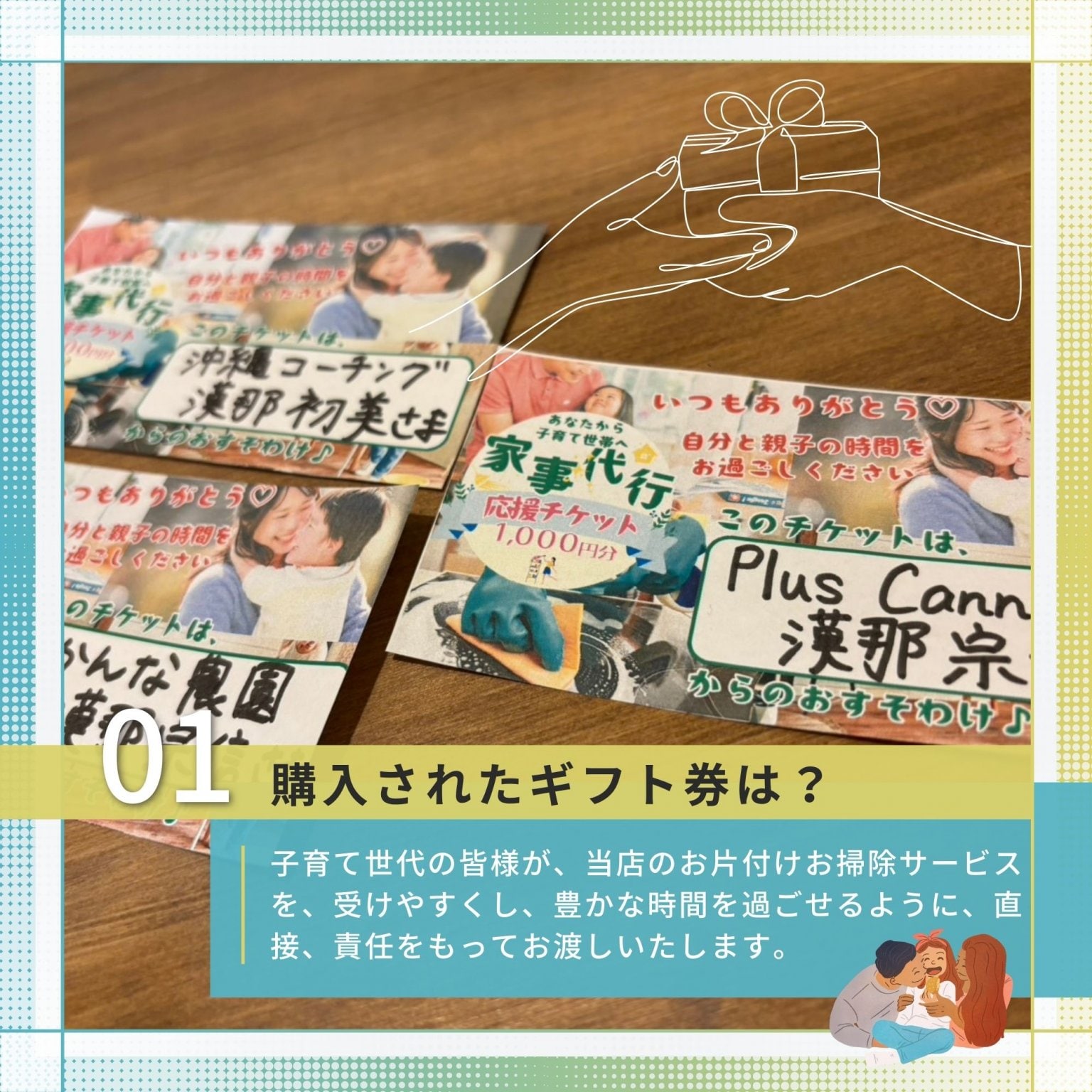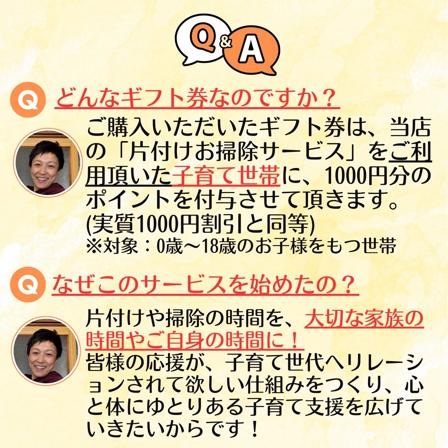 ご購入いただいたギフト券で私の「片付けお掃除サービス」をご利用頂いた子育て世帯に、1000円分のポイントを付与させて頂きます。(実質1000円割引)