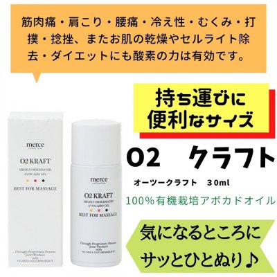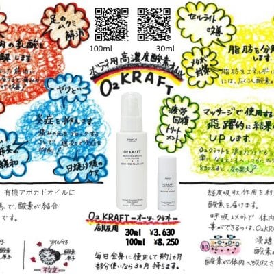 100%有機栽培アボカドオイルの分子に特殊な技術によって酸素原子を結合し高濃度に酸素を含有させたO2クラフトは優れた浸透性で皮膚に吸収され、驚くほどの効果を発揮します。特殊な製法によって生まれた「酸素の力」を、是非実感して下さい!