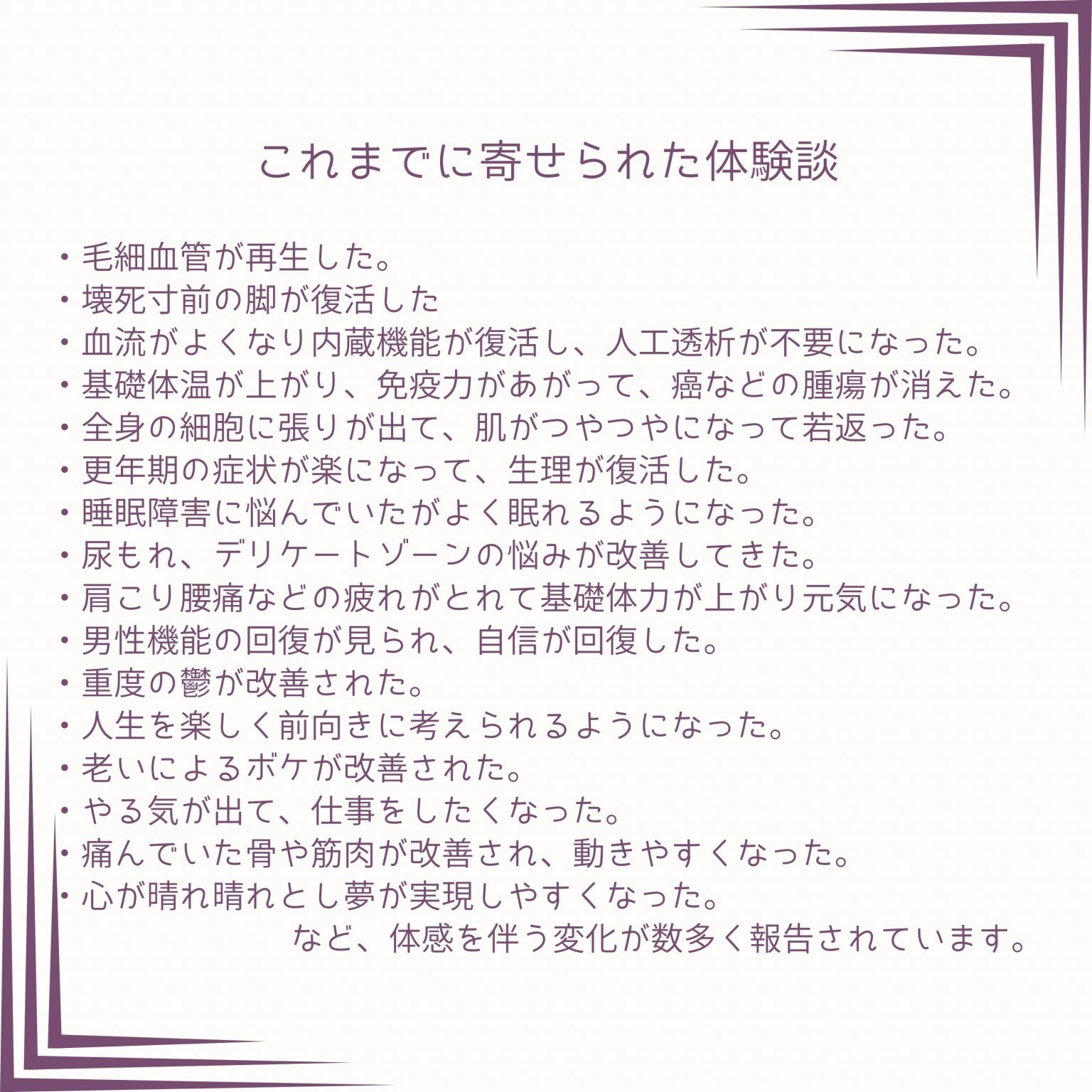 ・⾎流がよくなり内蔵機能が復活し、⼈⼯透析が不要になった。