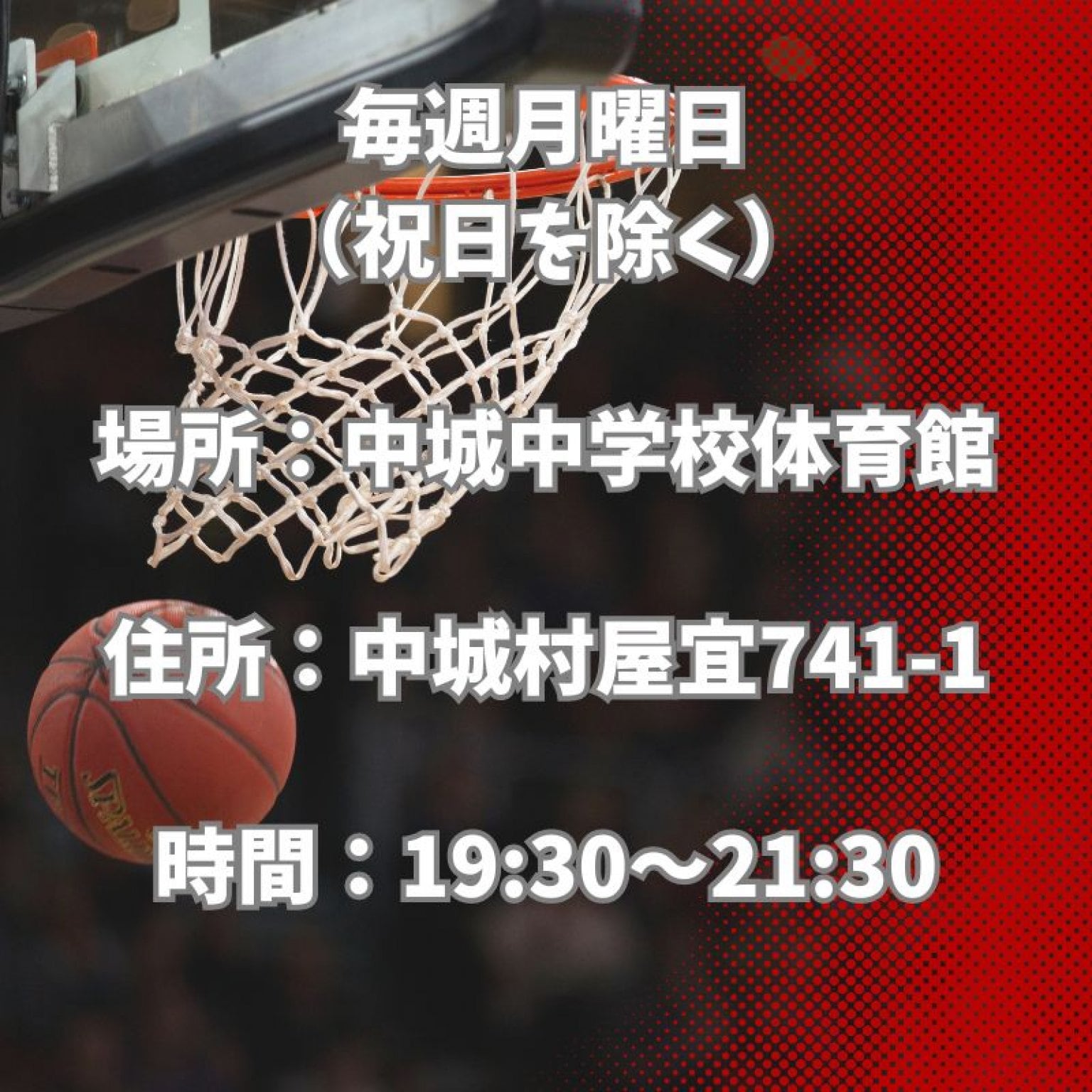 毎週月曜日(祝日を除く)、中城中学校体育館にて19:30〜21:30に開催。