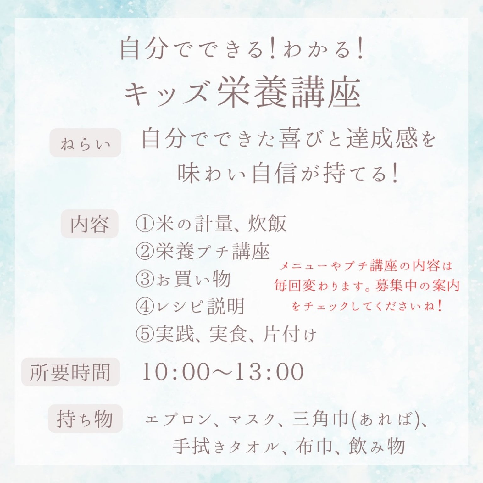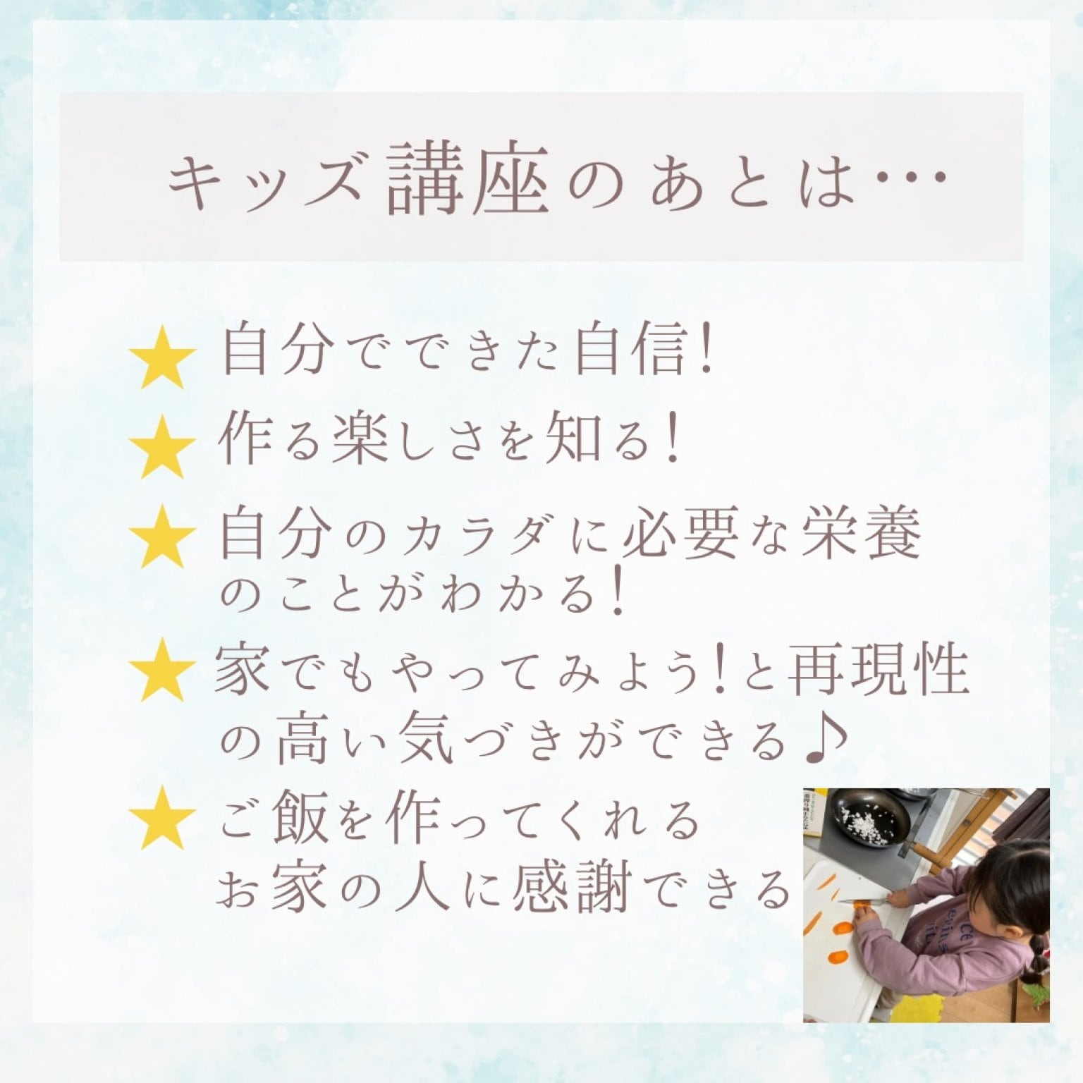 管理栄養士、栄養教諭としての知識・経験と2人の子育て中のママとしての経験から、発達に合わせた学びと実践を行います。
