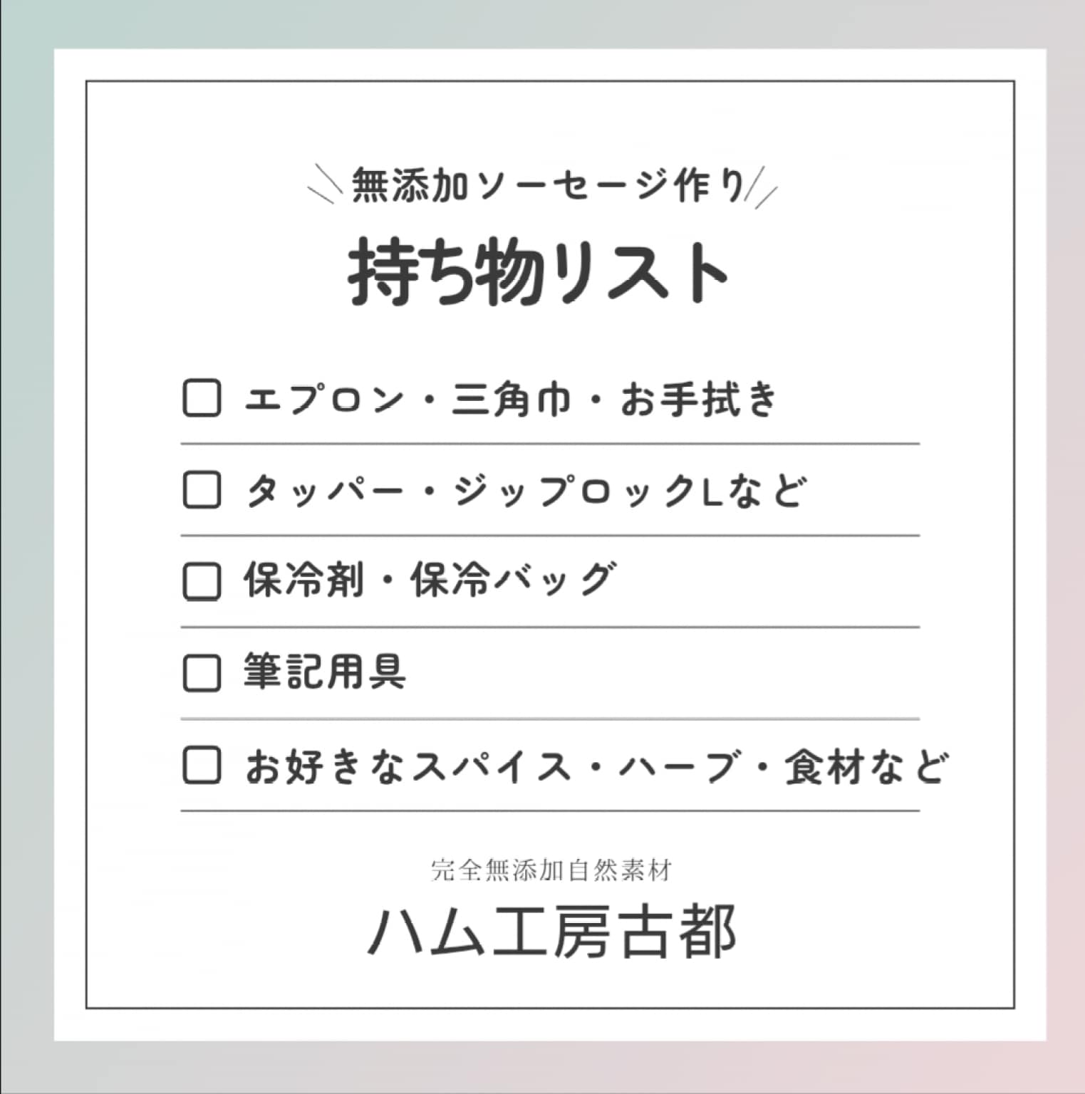 エプロン、三角巾、筆記用具、タッパーやジップロックLサイズ(ソーセージを入れるもの)、お手拭き、