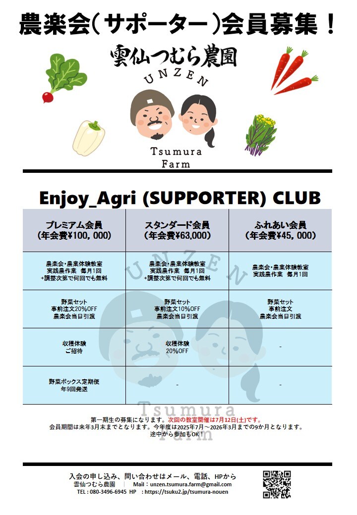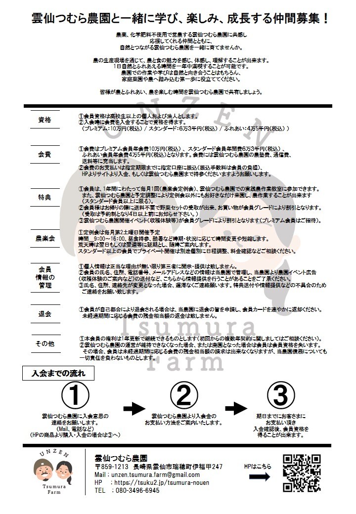 ①会費はふれあい会員年会費4万5千円(税込)となります。会費には雲仙つむら農園の農塾費、通信費、送料等に充当します。