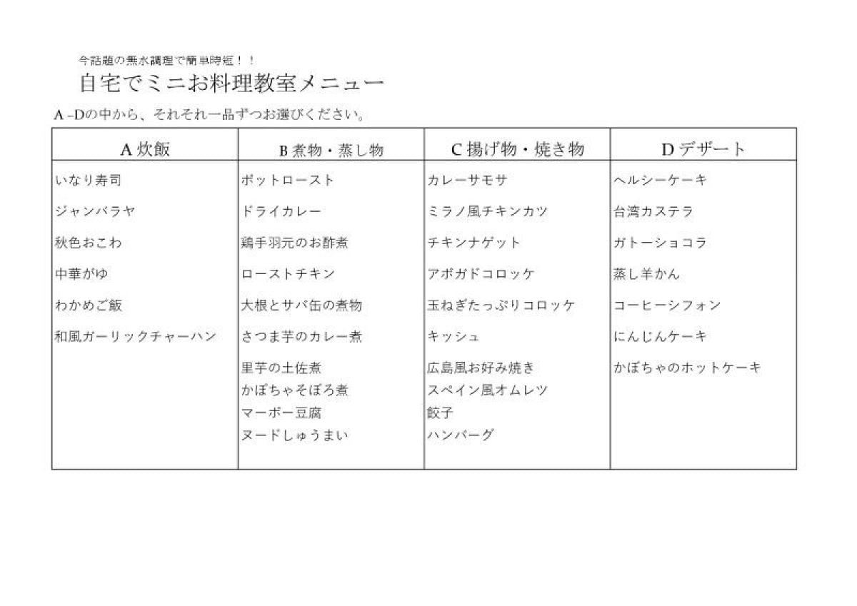 A炊飯、B煮物・蒸し物、C揚げ物・焼き物、Dデザートから三品お選びいただきます。