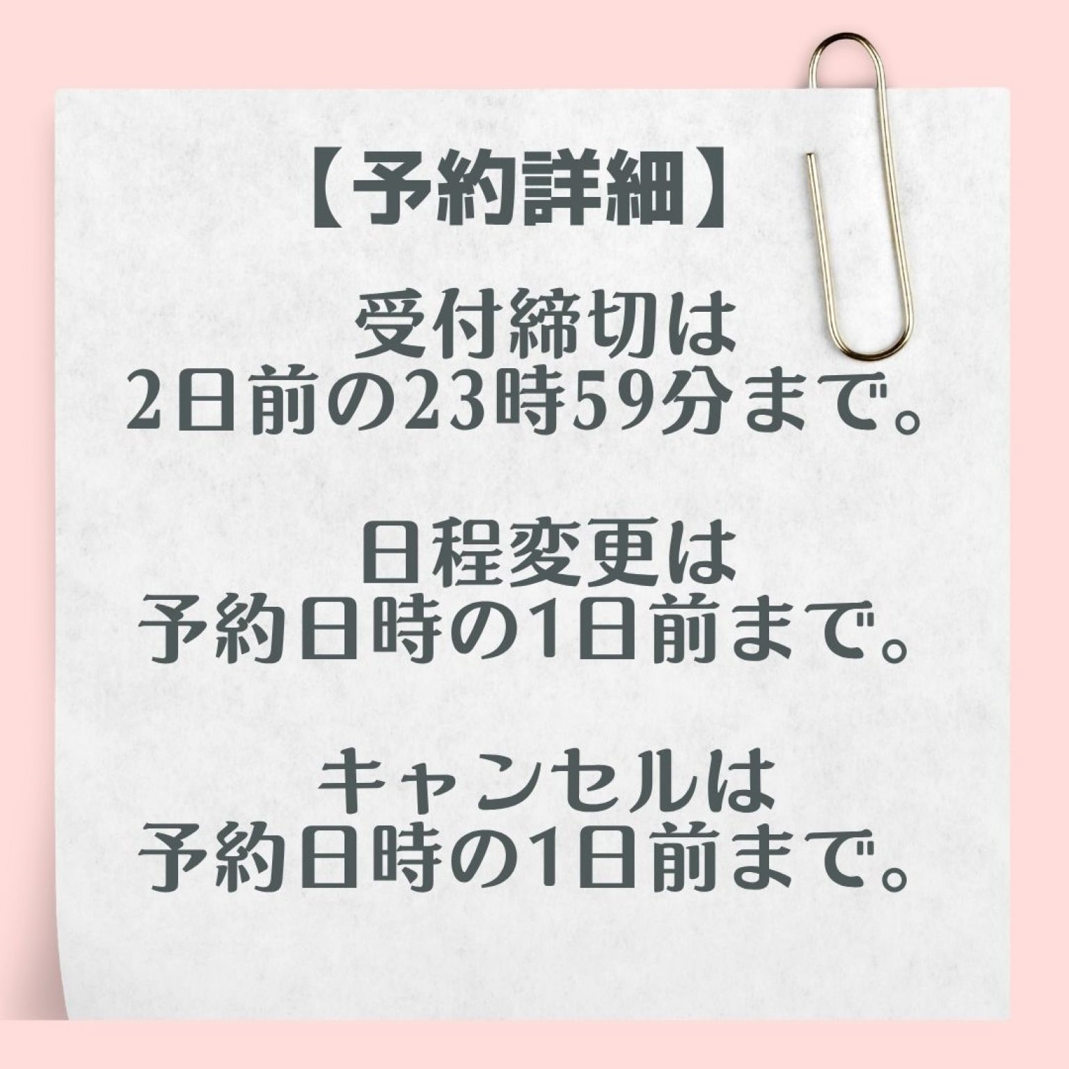 ※ご予約いただきましたお時間枠を超過しますと、延長料金が発生してしまいますので、下記目安所要時間をご参考にご予約ください。