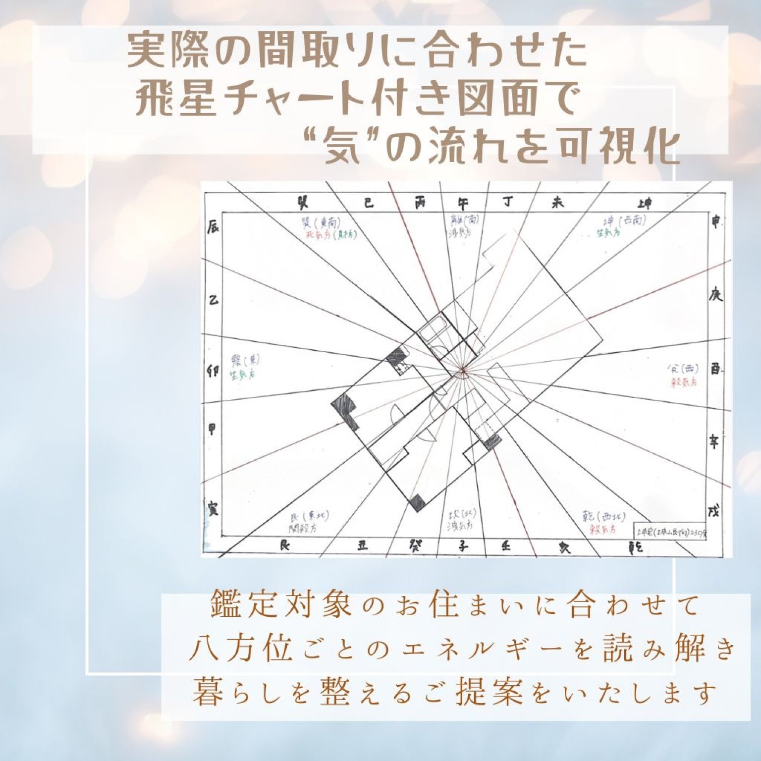 紫微斗数の知識も取り入れながら、本格的な風水理論に基づいた鑑定を行います。九星やラッキーカラーなどの簡易的な風水ではなく、三元九運、八宅法、二十四方位、本命卦、飛星風水などの多面的な手法を用いて、空間の“気”の流れを丁寧に読み解きます。
