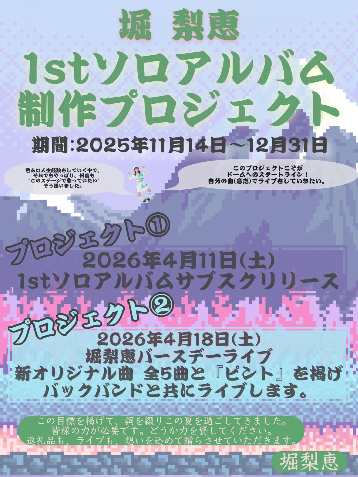 堀梨恵オフィシャルサイトでは、ライブ情報やブログ等の先行配信をお届けします!
