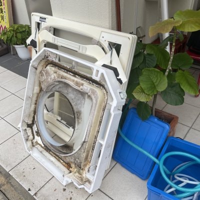 ⑦専用の高圧洗浄機でアルミフィンに付いたカビ汚れを除去します。