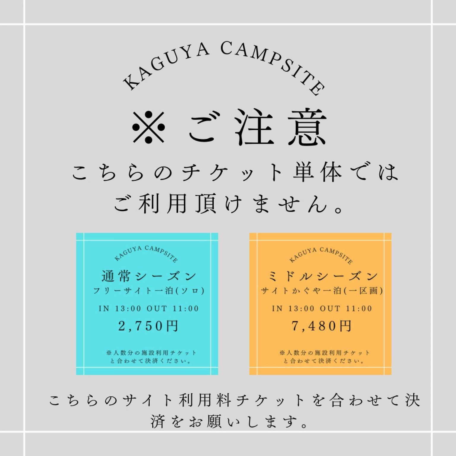 キャンプ場かぐやサークルサイトの施設利用料(大人)専用チケットとなります。チケットはサイト利用料チケットとあわせて人数分の購入をお願いいたします。