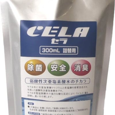 次亜塩素酸(HClO)を主成分とし、独自の製法で生成されるCELA(セラ)は、pH6.5の弱酸性で、有効塩素の比率の高い(=除菌力の高い)水です。菌やウイルスに反応して強力に除菌し、同時に悪臭成分に働きかけて消臭もできます。ほとんど無臭で、塩素ガスの発生もなく、直接肌にふれても人体への影響は心配ありません。長期間、弱酸性を保持し、その後は徐々に弱アルカリ性に移行するため、他の塩素系のものと比べ、金属の腐食、環境負荷も小さく、まさに理想的な除菌・消臭剤といえます。