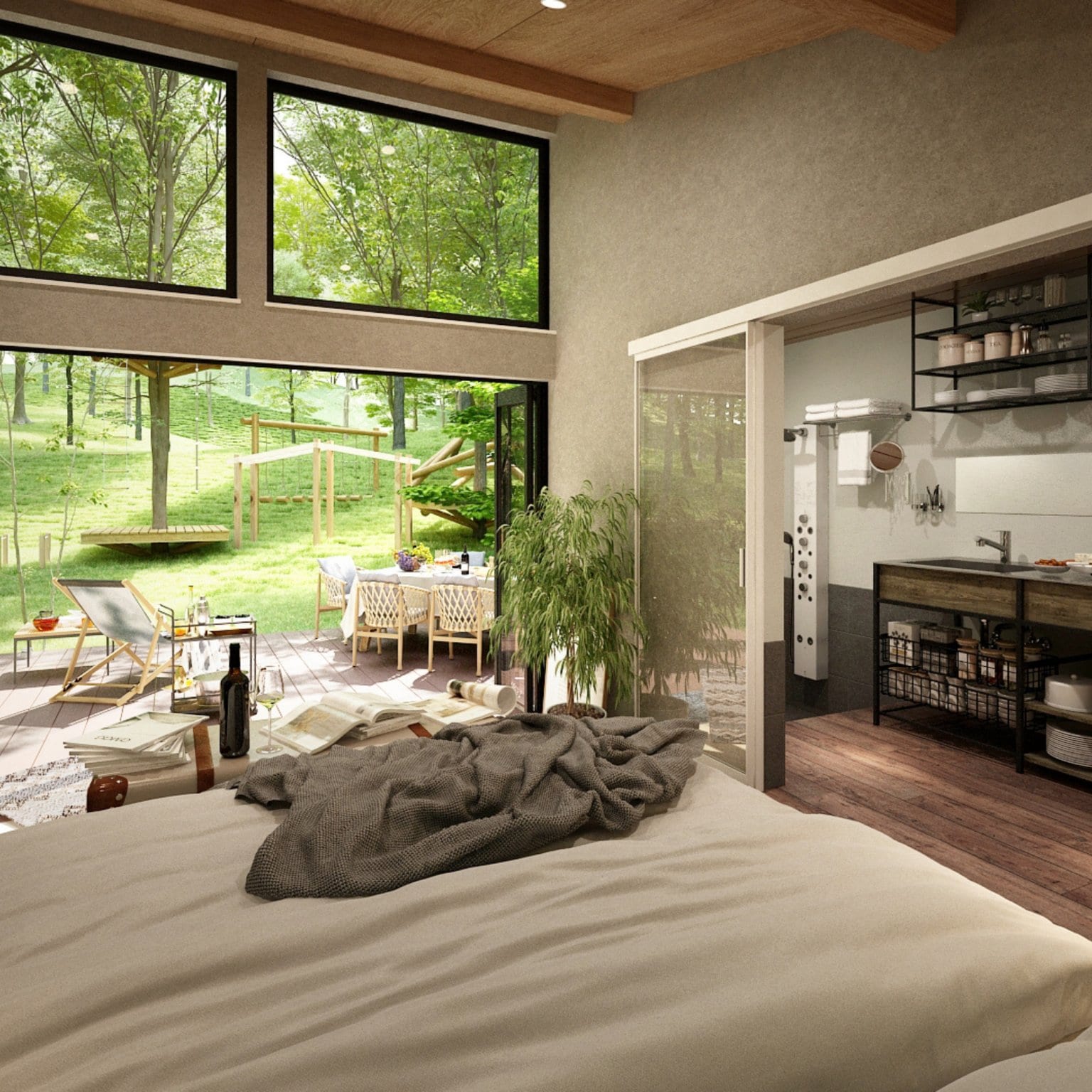 【内部建具・床材】建具:アルミフレーム+全面ガラス/床材:杉無垢板