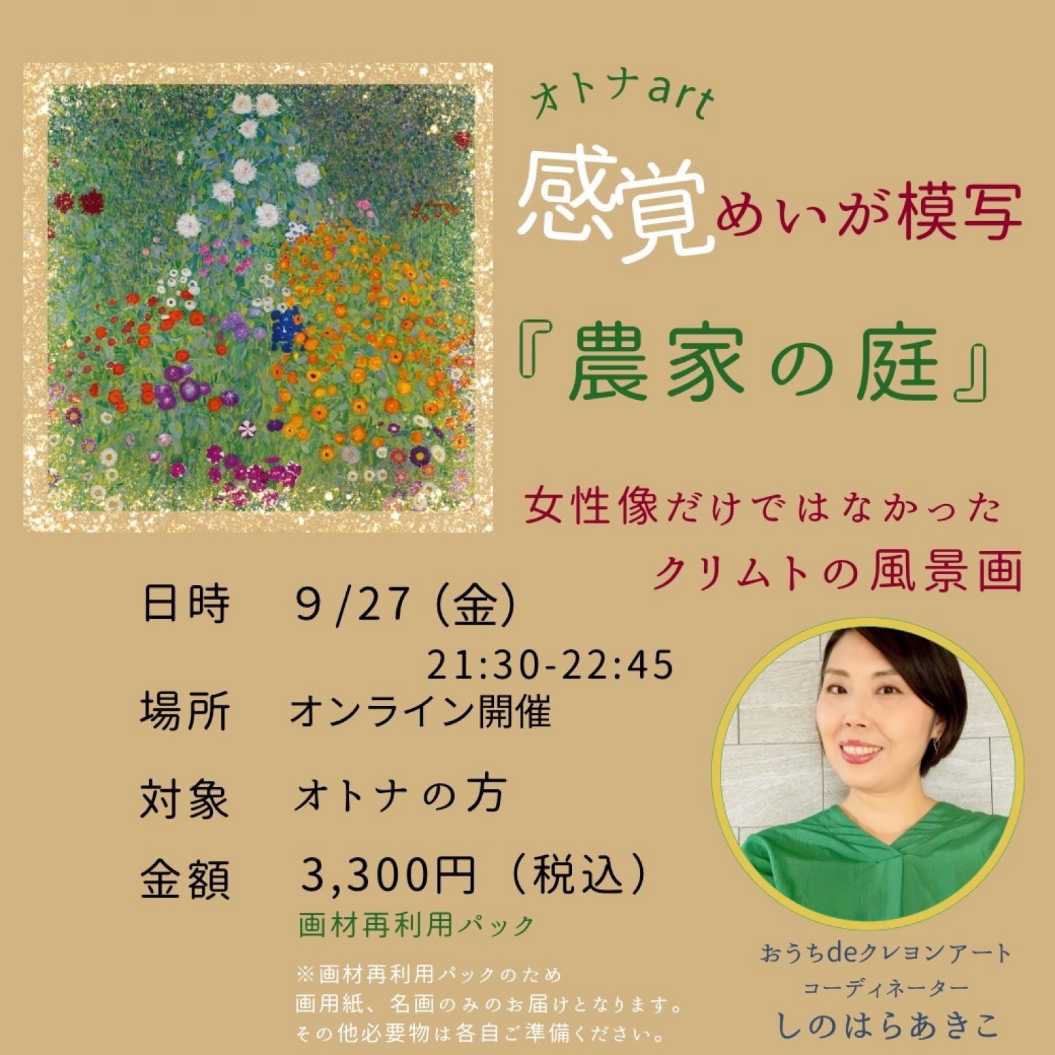 こちらのチケットは、以前参加されたことがある方で、オイルパステルやオリーブオイルは必要ない、見本の名画、必要な画用紙と今回必要な画材のみ送って欲しいという方向けとなります。