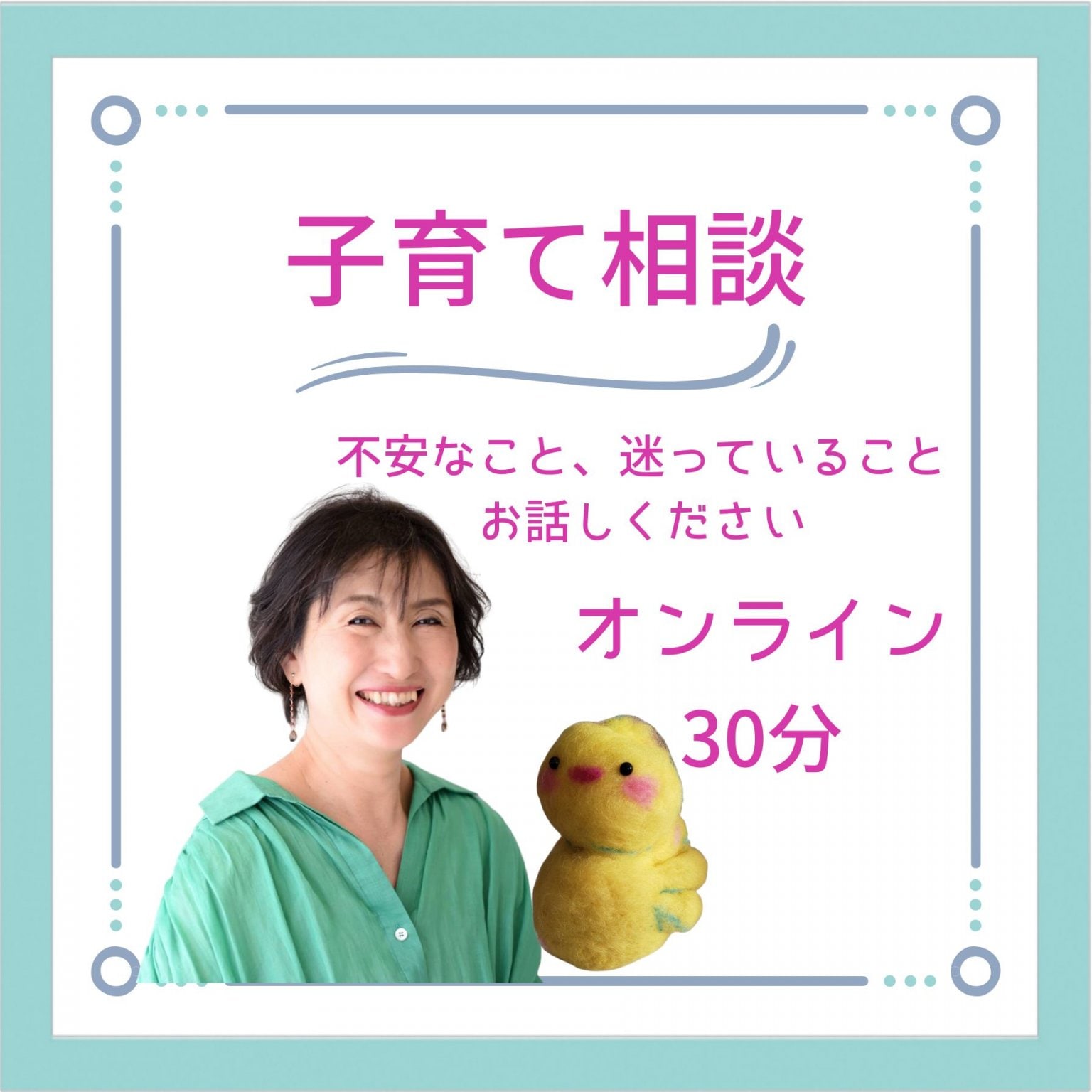 ちょっとした疑問やどうしたらいいのかな?と迷っていることなどお友達にお話しするような感覚で利用していただければ嬉しいです。お子さまについての事だけでなく、お母さまが思っていること、困っていること、誰かに聞いてもらいたいことなど、なんでもお話しください。