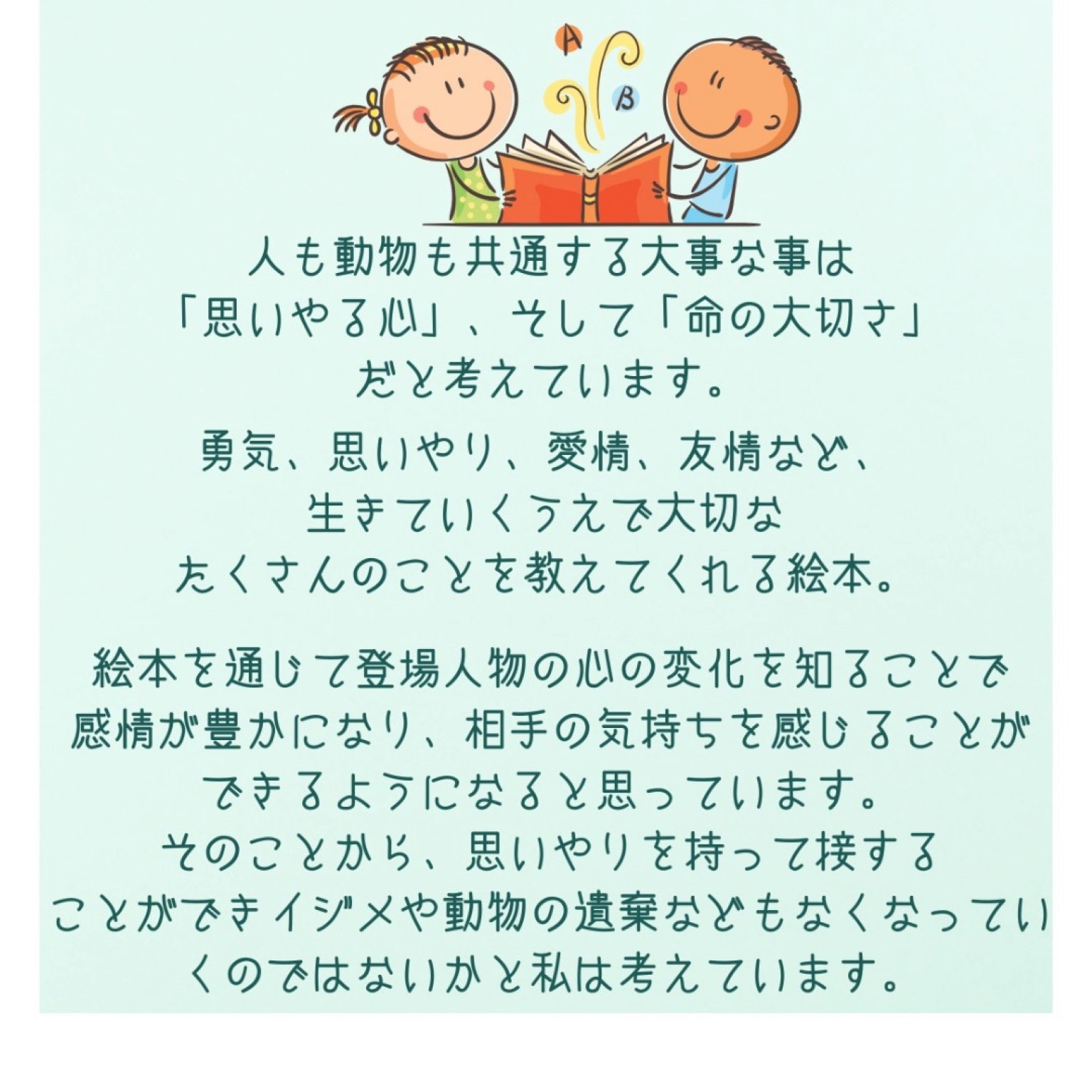 絵本を通じて、登場人物の心の変化を知ることで感情が豊かに、また、相手の気持ちを感じることができるようになることで思いやりを持って接することでイジメや動物の遺棄などもなくなっていくのではないかと私は考えています。