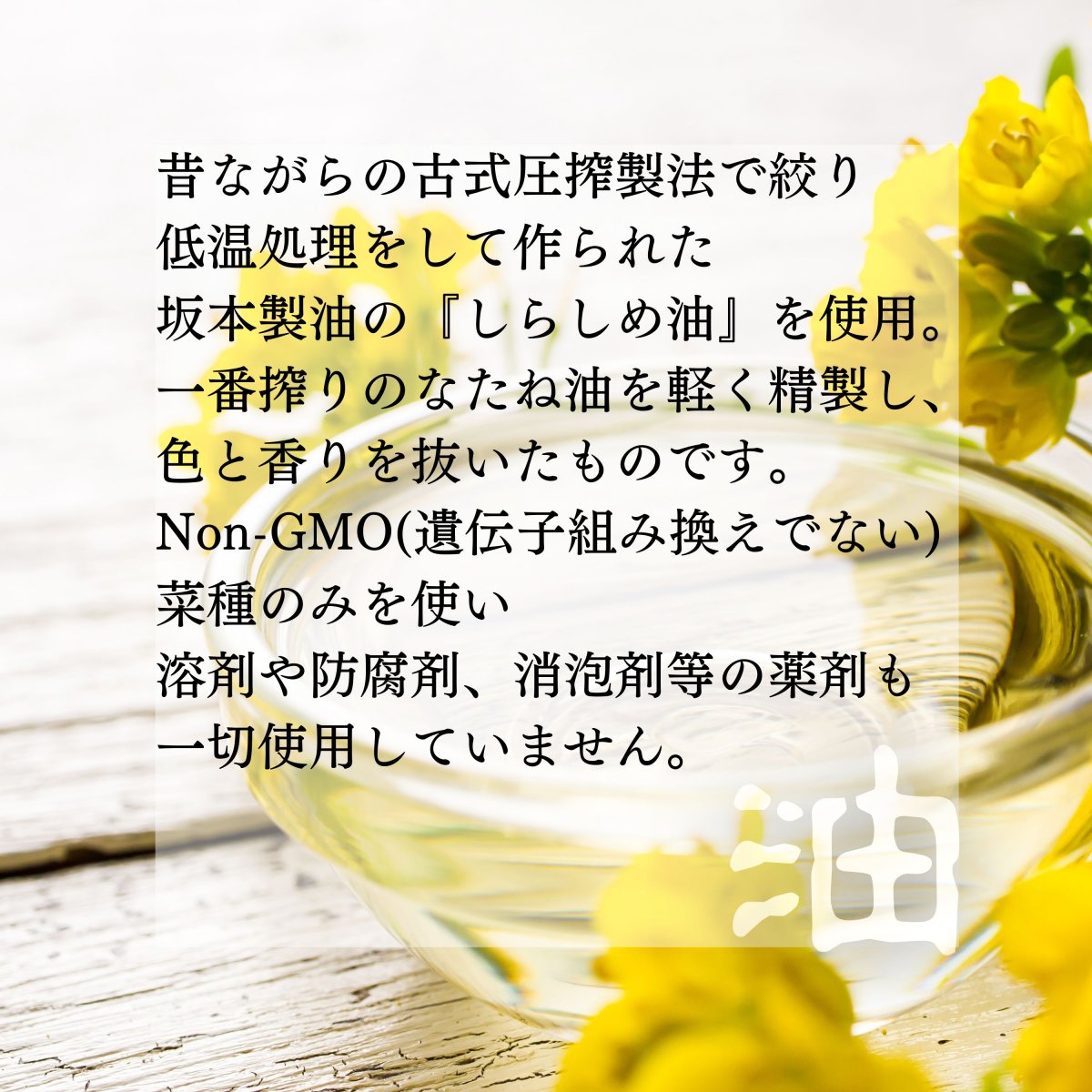 古式圧搾絞りで作られた坂本製油さんの『しらしめ油』を使用。