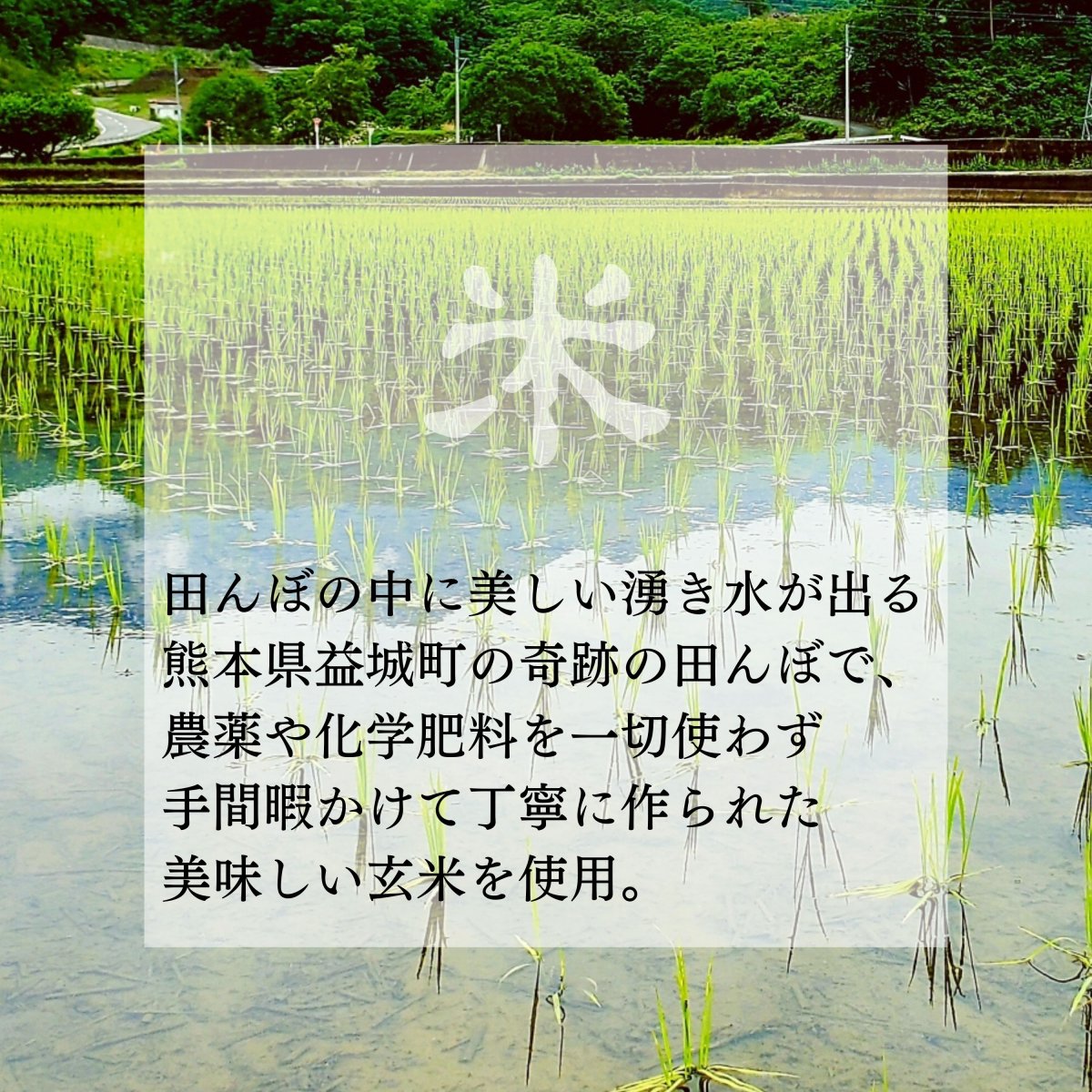田んぼの中に美しい湧き水が出る奇跡の田んぼで作られた熊本県産の美味しい無農薬玄米を使用。