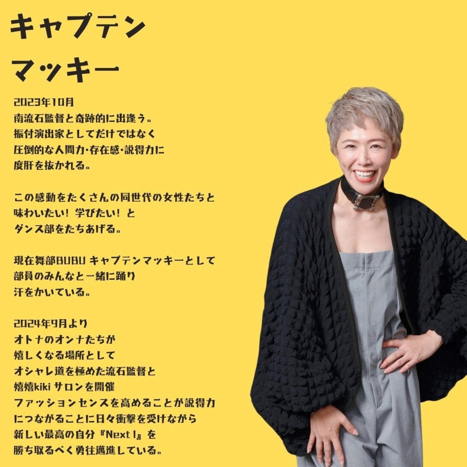 2024年、舞部BUBU キャプテンマッキーとして部員のみんなと一緒に踊り汗をかいている。またオトナのオンナたちが嬉しくなる場所としてオシャレ道を極めた流石監督と嬉嬉kiki サロンを開催。ファッションセンスを高めることが説得力につながることに日々衝撃を受けながら新しい最高の自分『Next I』を勝ち取るべく勇往邁進している。2026年5月出版決定。