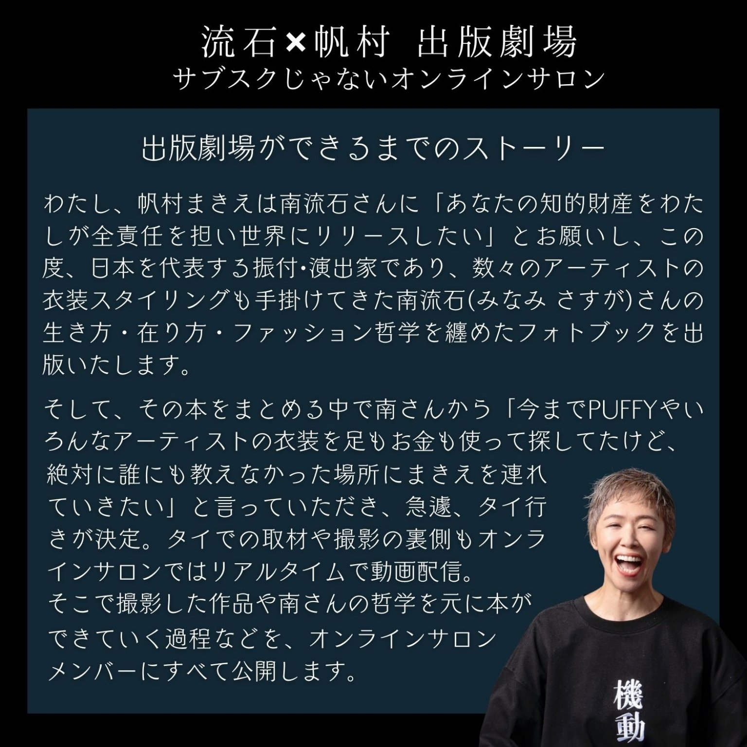 わたし、帆村まきえはこの度、日本を代表する振付•演出家であり、数々のアーティストの衣装スタイリングも手掛けてきた「南流石(みなみ さすが)さんの生き方・在り方・ファッション哲学を纏めたフォトブックを出版することが決まりました。