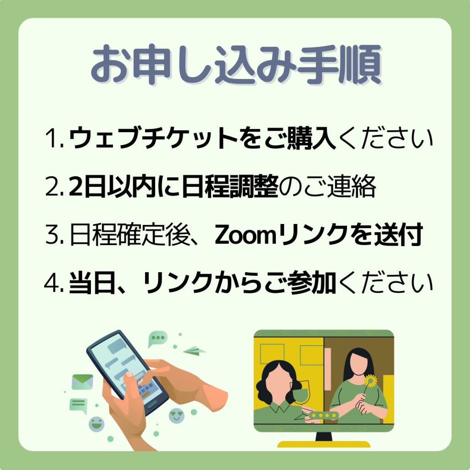 ご購入後に日程調整のご連絡をさせていただき、確定後にZoomの参加URLをお送りします。