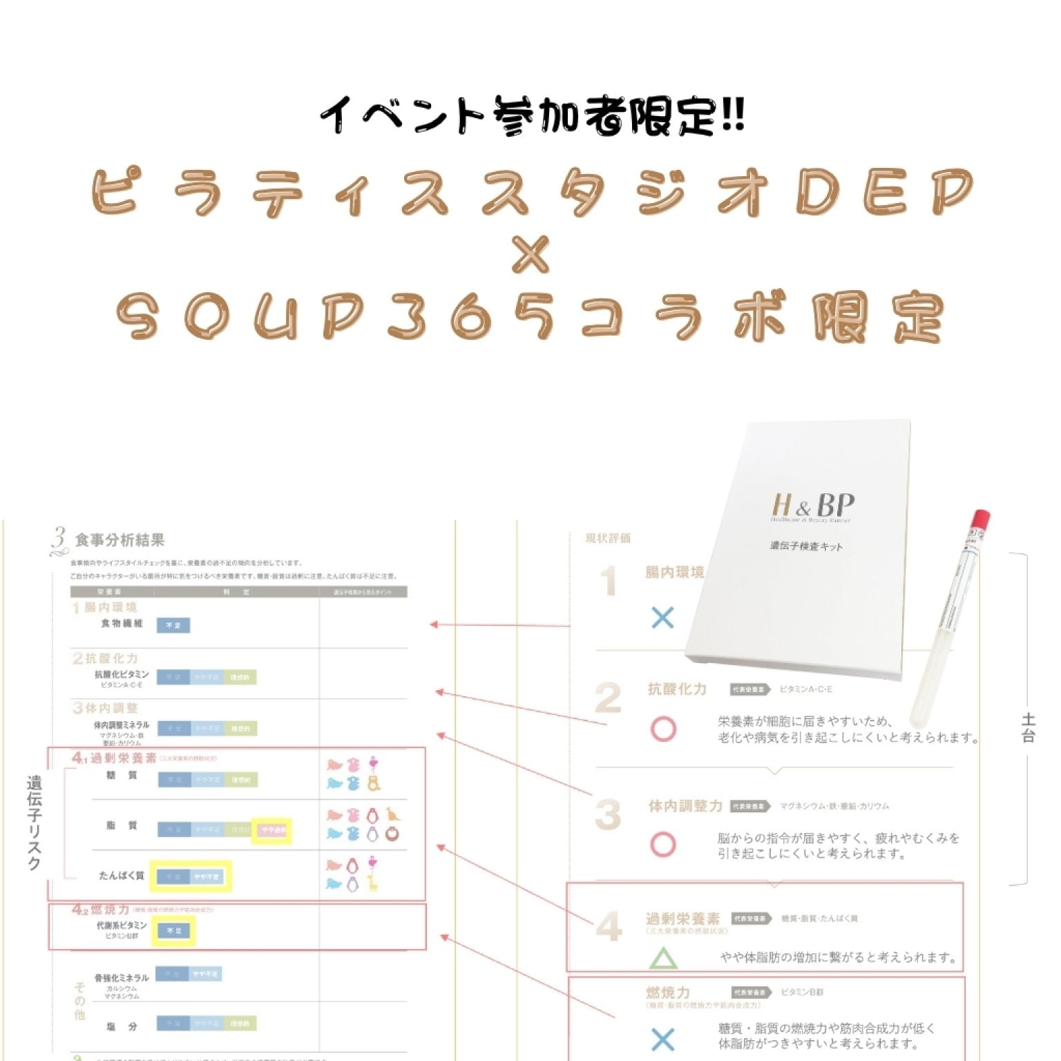 通常、遺伝子検査をされた方に栄養バランス分析を実施しています。この分析は管理栄養士が作成し、設問に答えていくだけで現状どういったバランスの食事をしているかが分析され、一覧で見えるようにできています。結果はメールでお送りしますので、帰られた後いつでも確認することが可能です。摂れているようで足りていない栄養も、逆に摂取し過ぎている栄養も見える化することで、今後の食事に意識を向けることができます。看護師が分析結果について簡単なアドバイスも行いますので、ぜひこの機会にご自身の身体を見つめ直してみませんか?