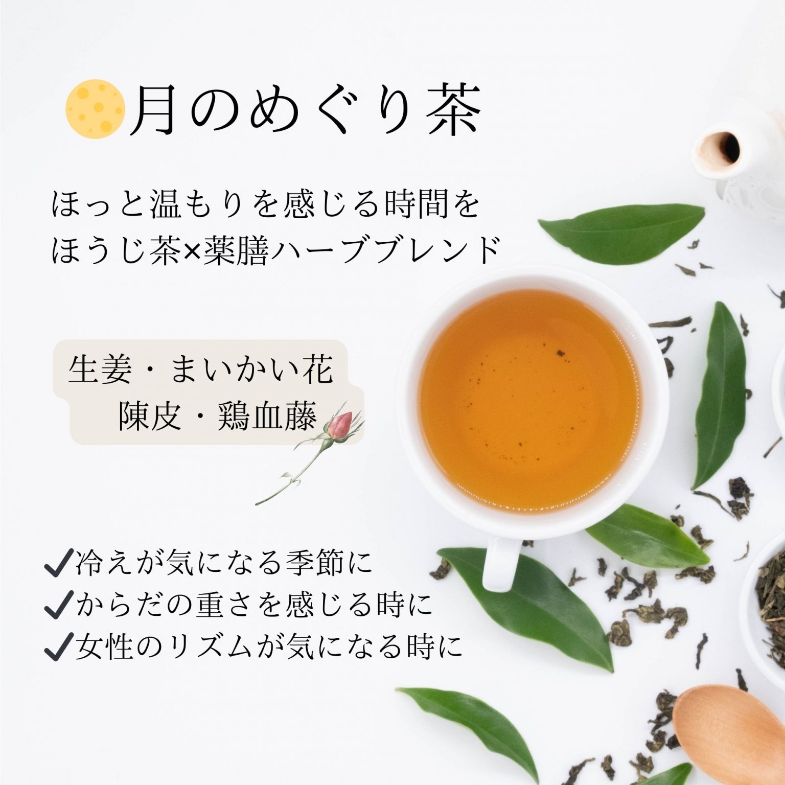 めぐりとやすらぎ、この2つが整うだけで毎日が少し軽くなる——そう気づいたことが、このシリーズ誕生のきっかけです。私自身、体調を崩したときに漢方に助けられた経験から、毎日の生活に無理なく取り入れられる“身体に寄り添うお茶”として仕上げています。