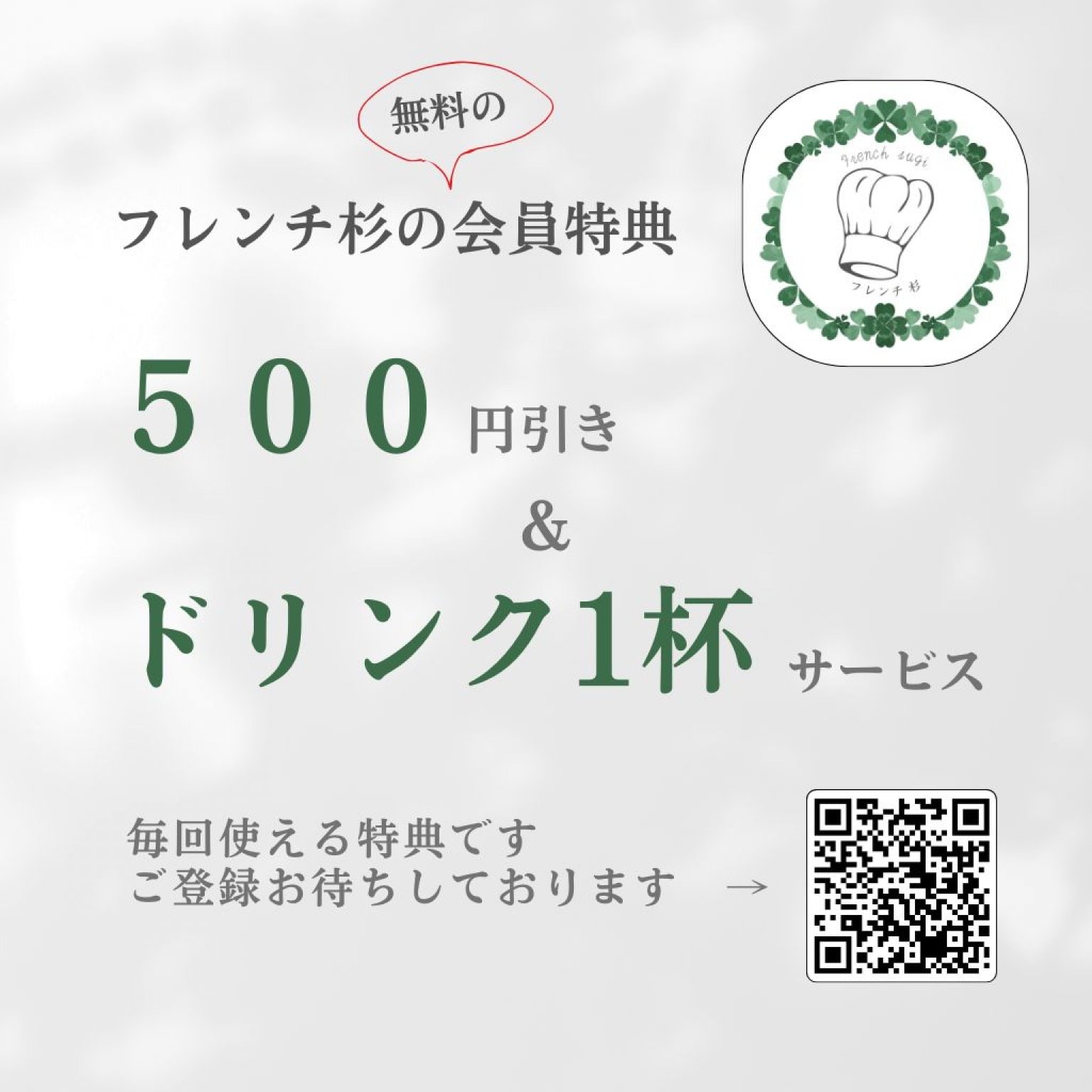 ※会員登録をしていただけた方は、いつでも500円引き+ワンドリンクをプレゼント。