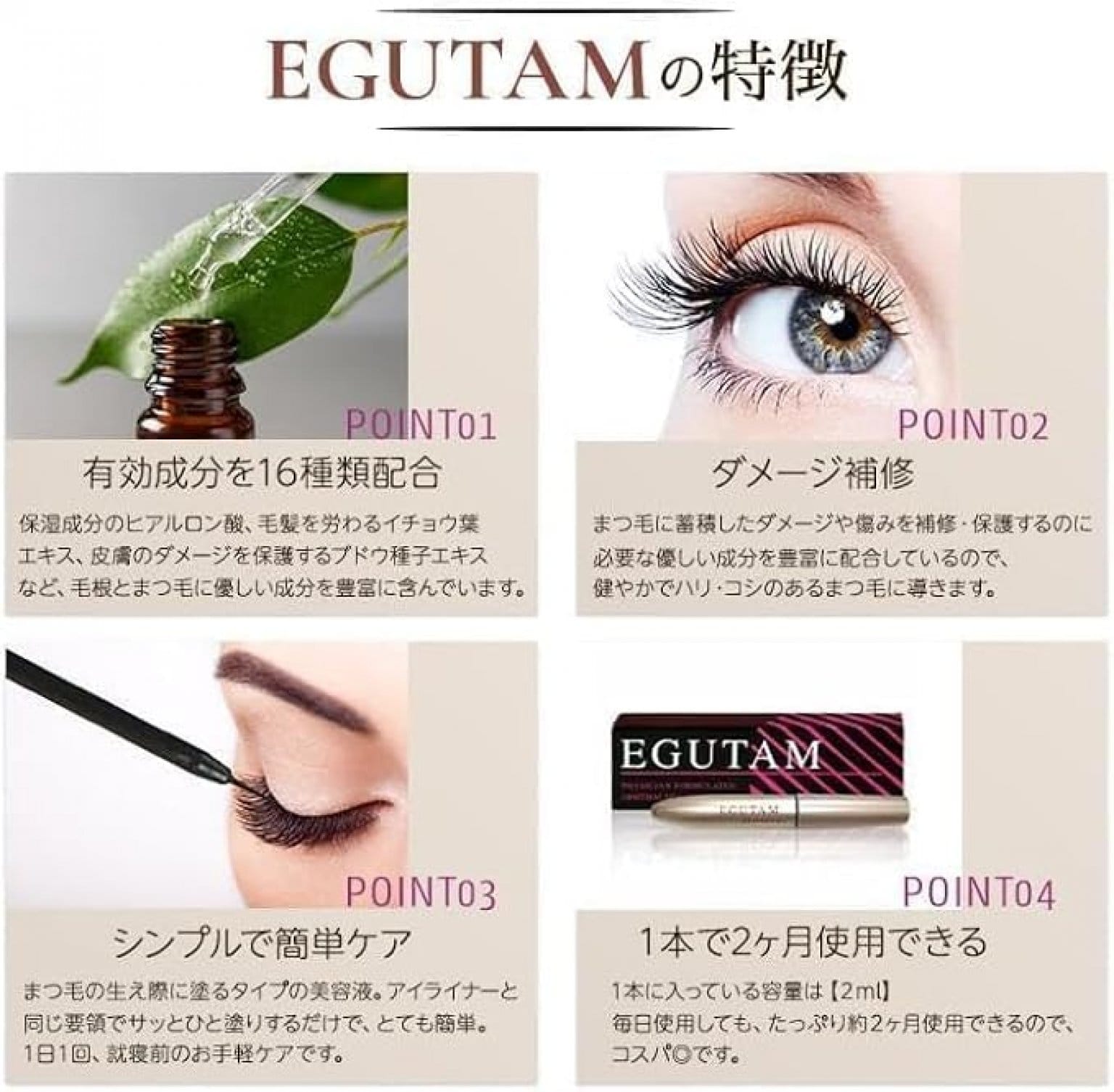 エグータム(EGUTAM)は、保湿成分や毛髪保護成分(ヒアルロン酸、イチョウ葉エキスなど)を贅沢に配合した、サロン専売の強力なまつ毛美容液です。