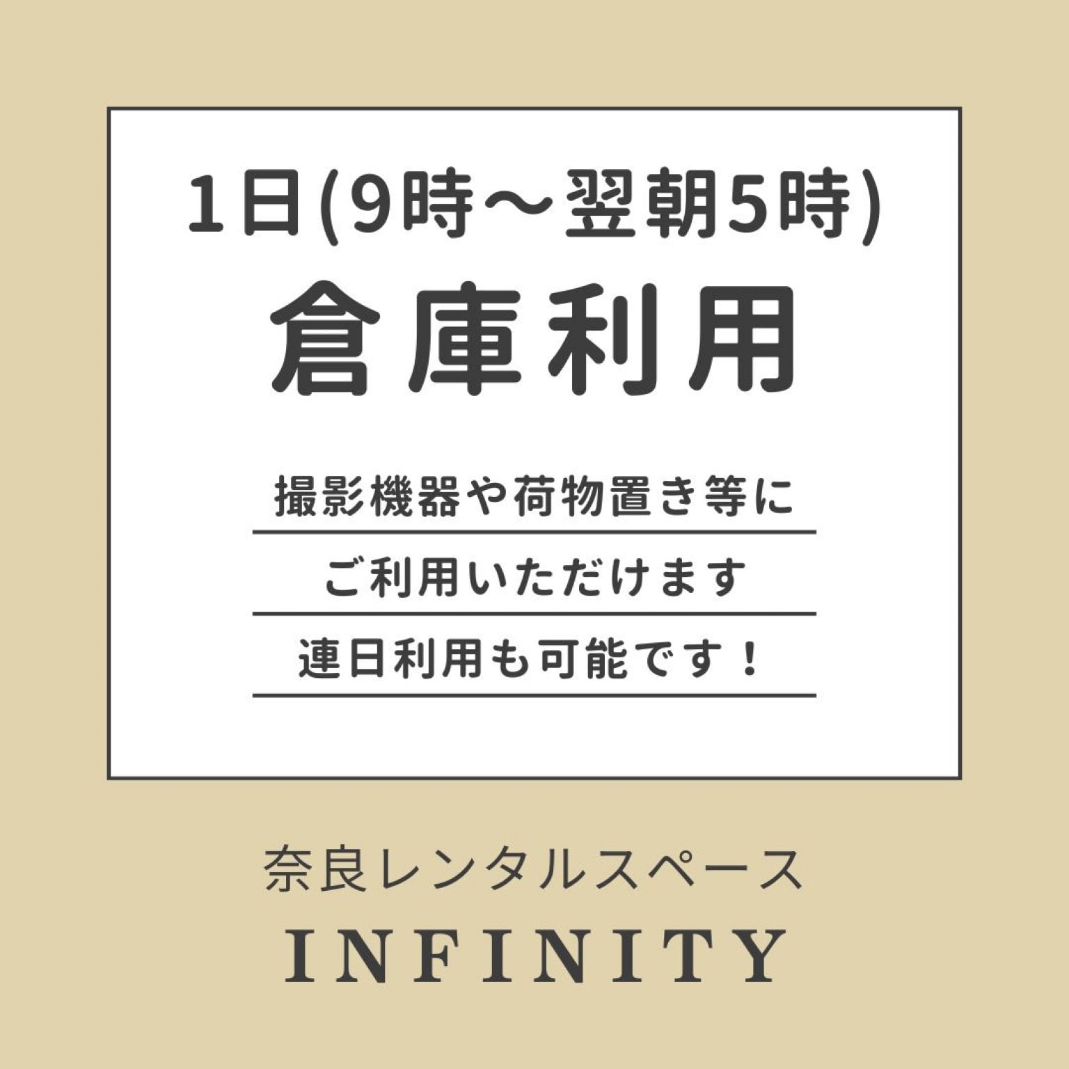 レンタルスペースINFINITY(インフィニティ)の「レンタル倉庫」利用のお支払いチケットです。朝9時〜翌朝5時までご利用いただけます。連日利用も可能ですのでご相談下さいませ。