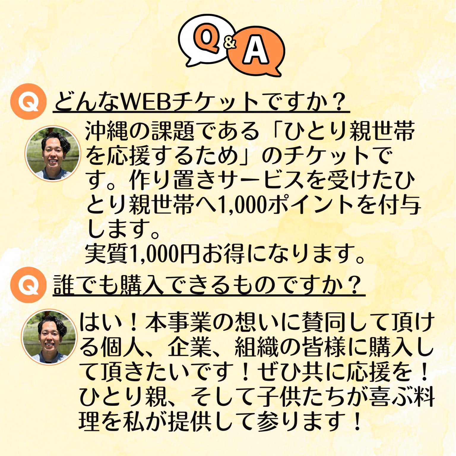 沖縄の課題である「ひとり親世帯を応援するため」のチケットです。本チケットで、私の出張作り置きサービスを利用するご家庭が「ひとり親世帯」の場合、サービス提供にあてられます。サービスを受けたひとり親世帯へ1,000ポイントを付与します。実質1,000円お得になります。(1世帯サービスごとに1回活用できます。)