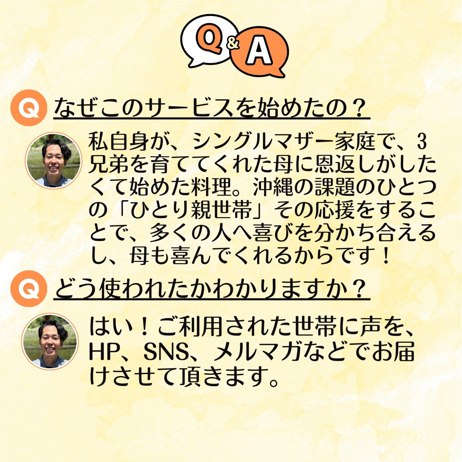 →私自身が、シングルマザー家庭で、3兄弟を育ててくれた母に恩返しがしたくて始めた料理。沖縄の課題のひとつの「ひとり親世帯」その応援をすることで、多くの人へ喜びを分かち合えるし、母も喜んでくれるからです!