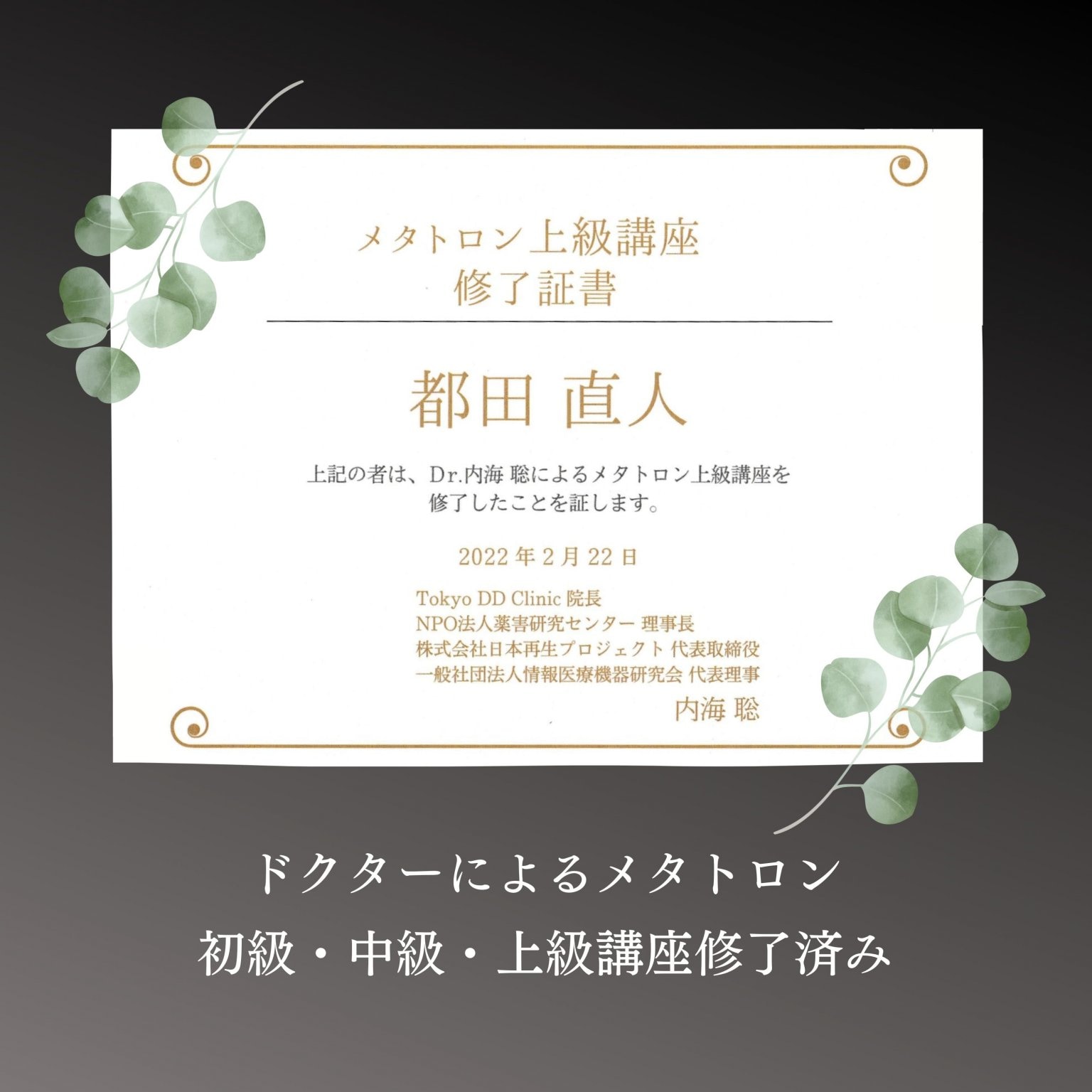 当サロンでは、一般社団法人情報医療機器研究会主催のメタトロンの初級・中級・上級講座を全て修了し、修了証書も頂いておりますのでご安心ください。講師は主にTokyo DDクリニックの内海聡(うつみさとる)医師です。NPO法人薬害研究センター理事長、株式会社日本再生プロジェクト代表取締役、一般社団法人情報医療機器研究会代表理事でもあります。