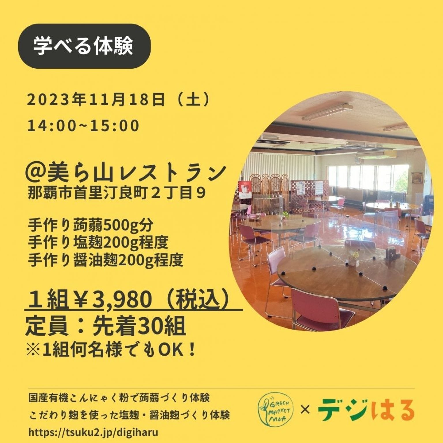 こんにちは!食育イベントのお知らせです!11月18日(土)14時@美ら山レストラン(那覇市首里汀良町2-9グリーンマーケットMOA那覇店敷地内)にて、蒟蒻・塩麹・醤油麹づくり体験を開催致します!募集詳細は下記の通りです!
