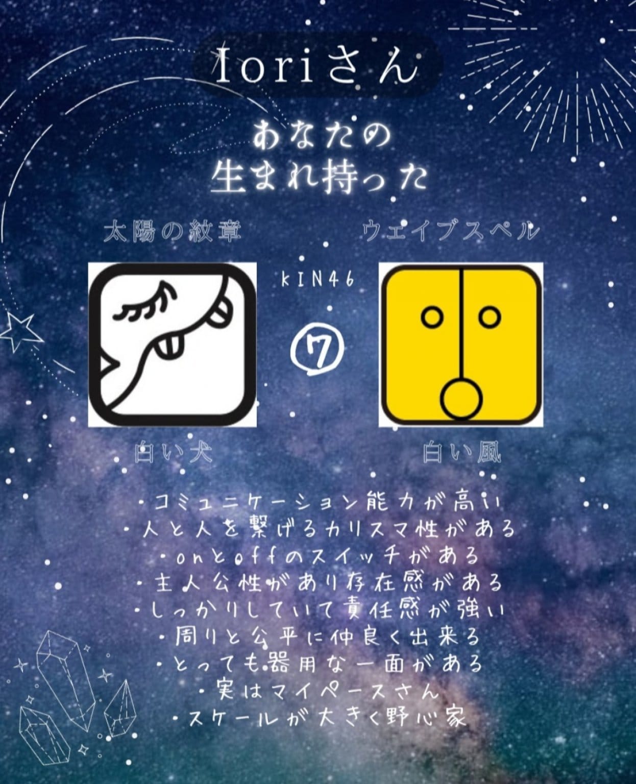 生年月日から、キンナンバー、太陽の紋章、ウェイブスペル、銀河の音を出し、あなたが産まれ持った性質をお伝えします。