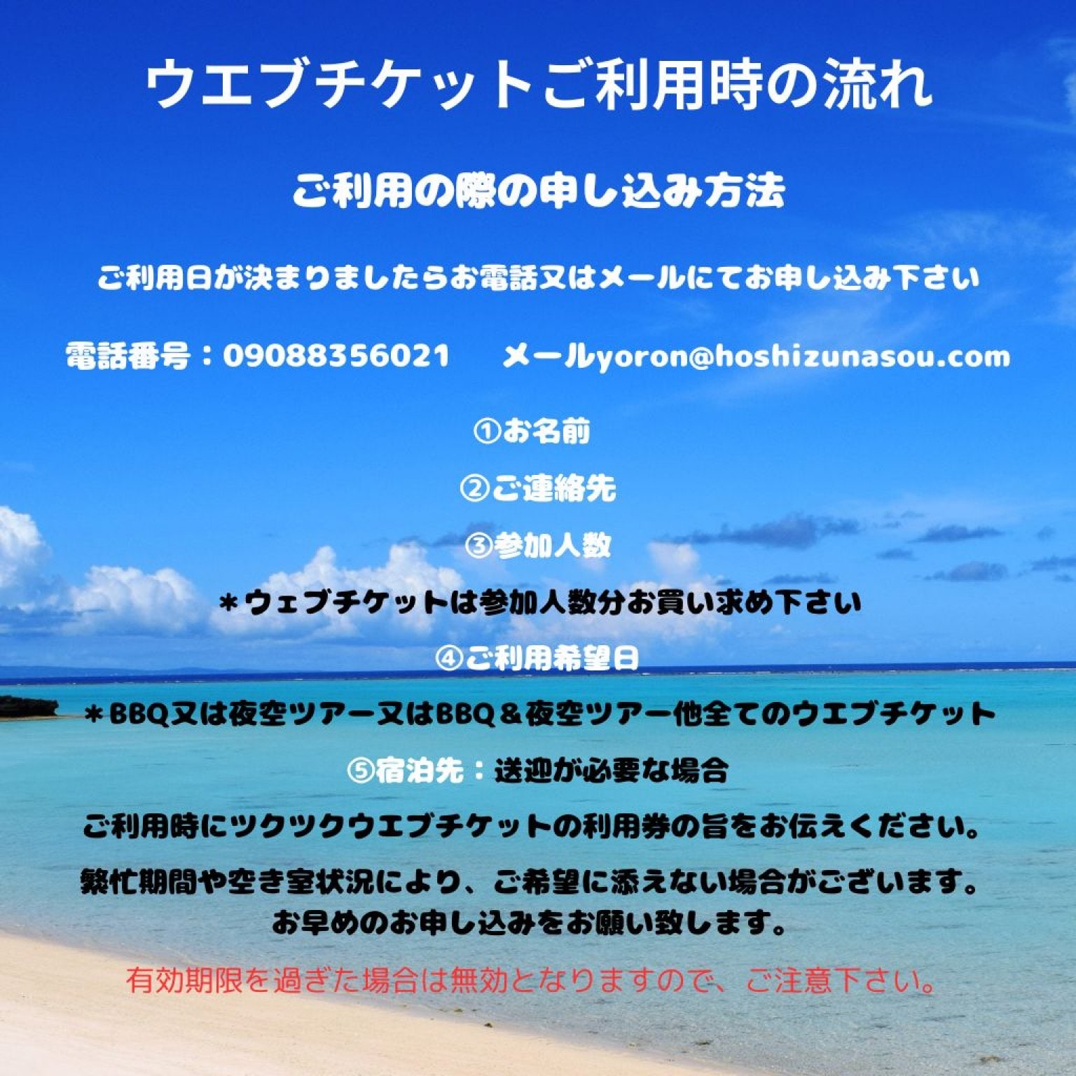 ●定員に達しだい予約を締め切らせて頂く為、ご希望の日に予約がお取り出来ない場合がございます。日程が決まっておりましたら、電話又は「星砂荘公式ライン@」メールにてお問い合わせ頂き、チケットのご購入をお願い致します。