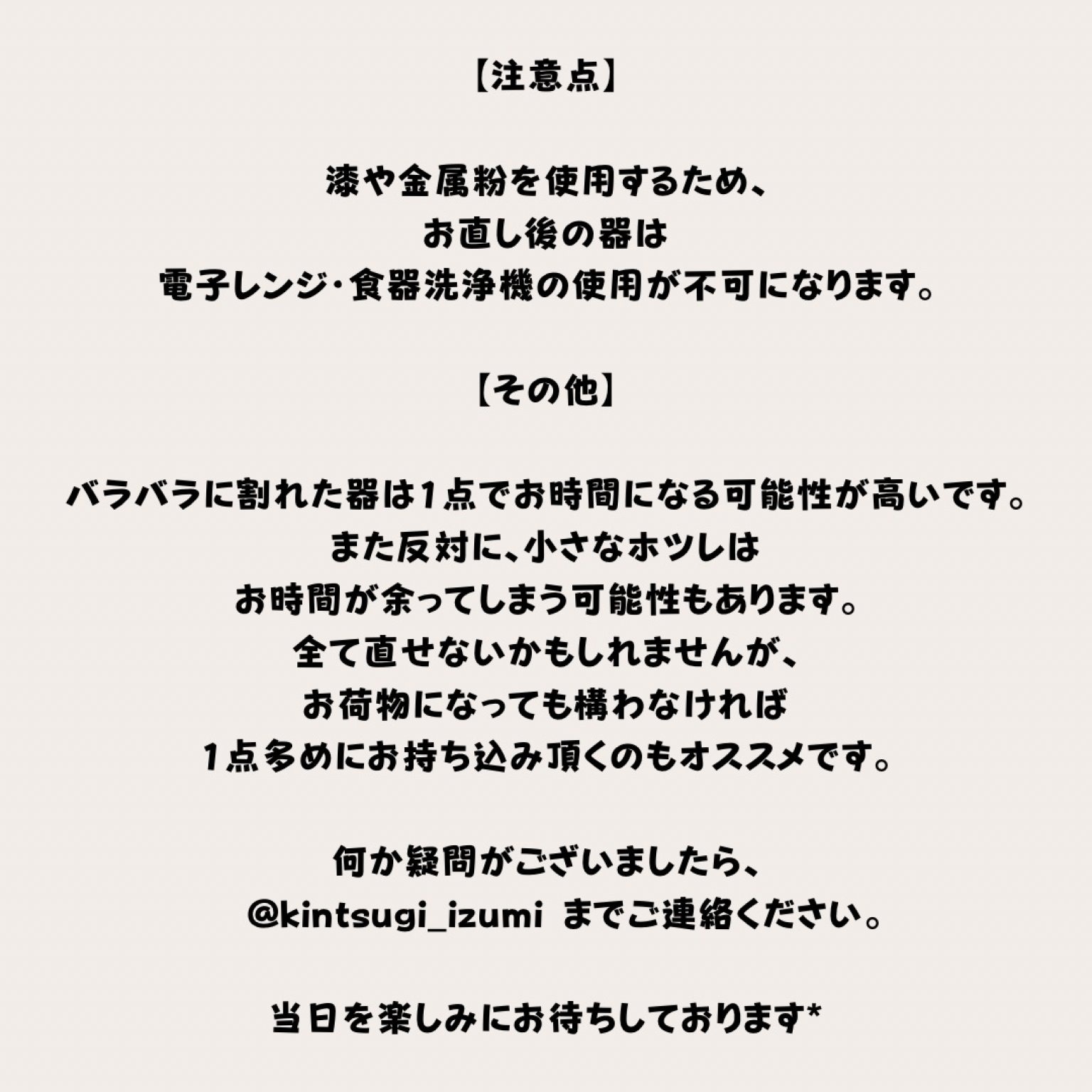 バラバラに割れた器は1点でお時間になる可能性が高いです。また反対に、小さなホツレはお時間が余ってしまう可能性もあります。全て直せないかもしれませんが、お荷物になっても構わなければ1点多めにお持ち込み頂くのもオススメです。