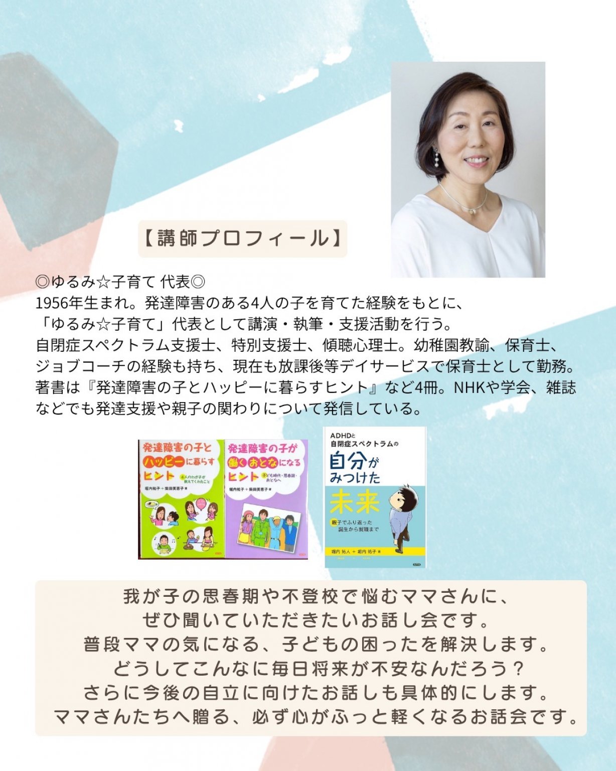 我が子の思春期や不登校で悩むママさんに、ぜひ聞いていただきたいお話し会です。
