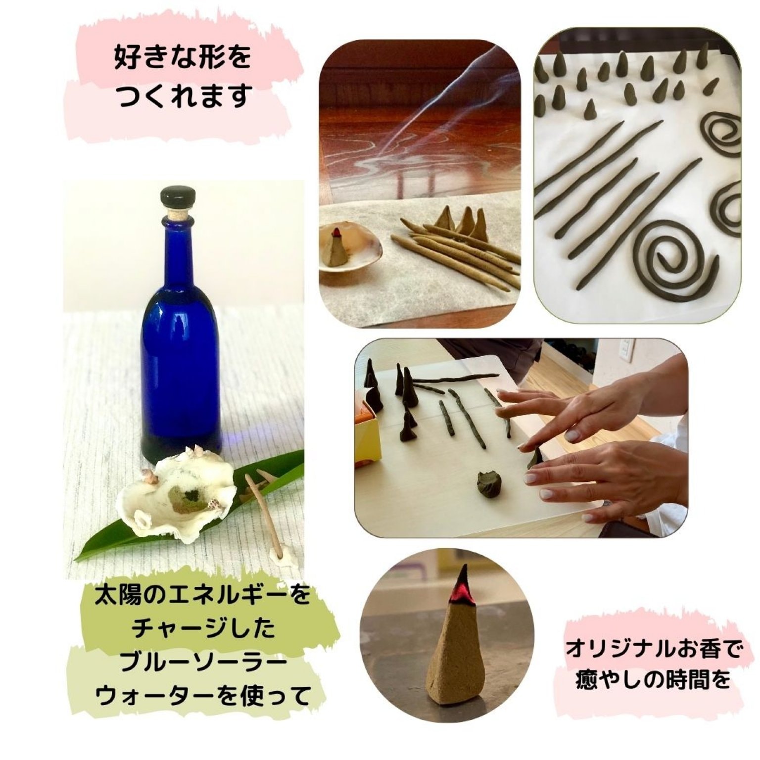 様々な効果効能のある「月桃」パウダー、同じく忌避効果があり、香りの良い「レモングラス」パウダー、お香作りには欠かせない椨粉(タブの木の樹脂の粉)を調合する。