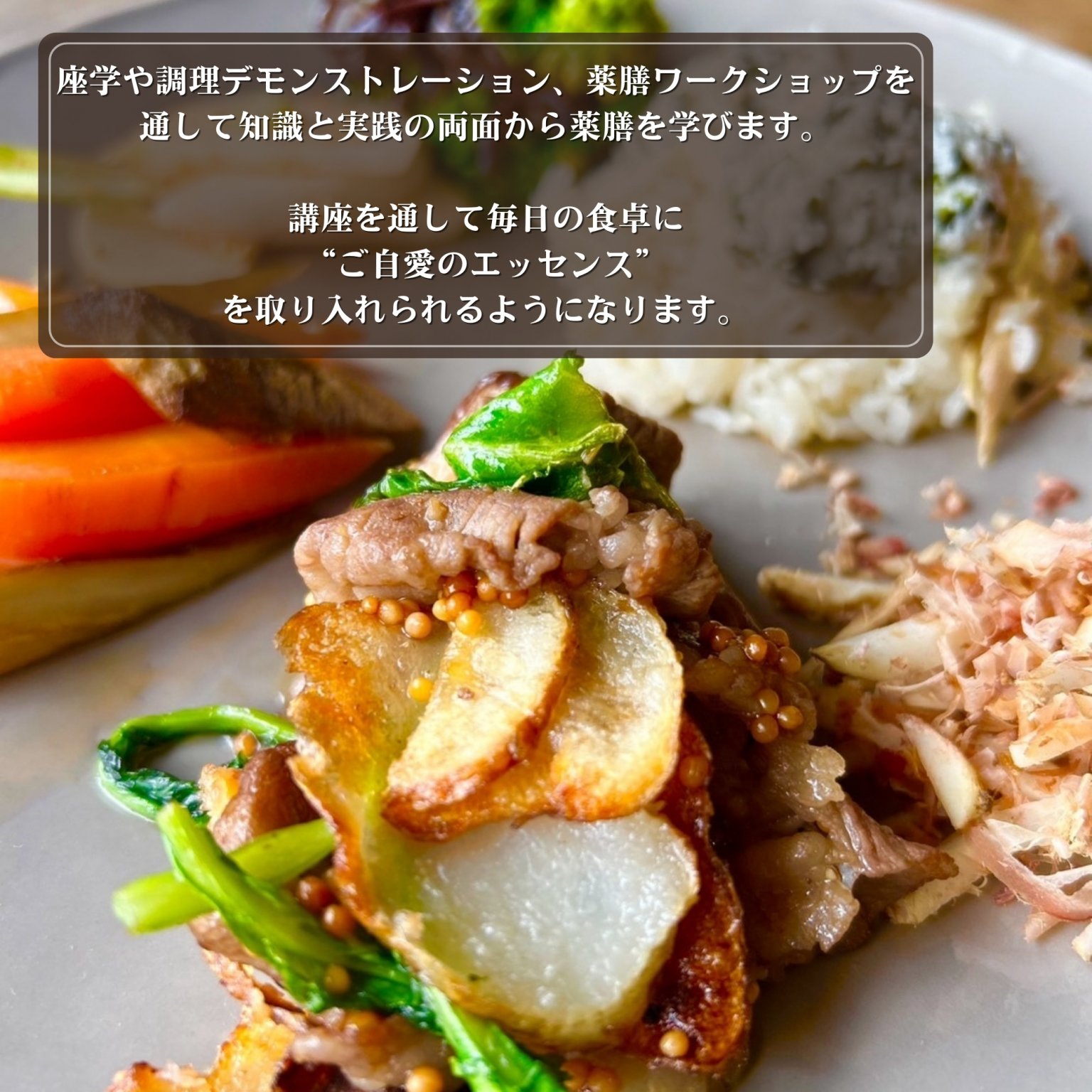 座学・調理デモンストレーション・薬膳ワークショップを通して、知識と実践の両面から薬膳を学び、毎日の食卓に“ご自愛のエッセンス”を取り入れられるようになります。