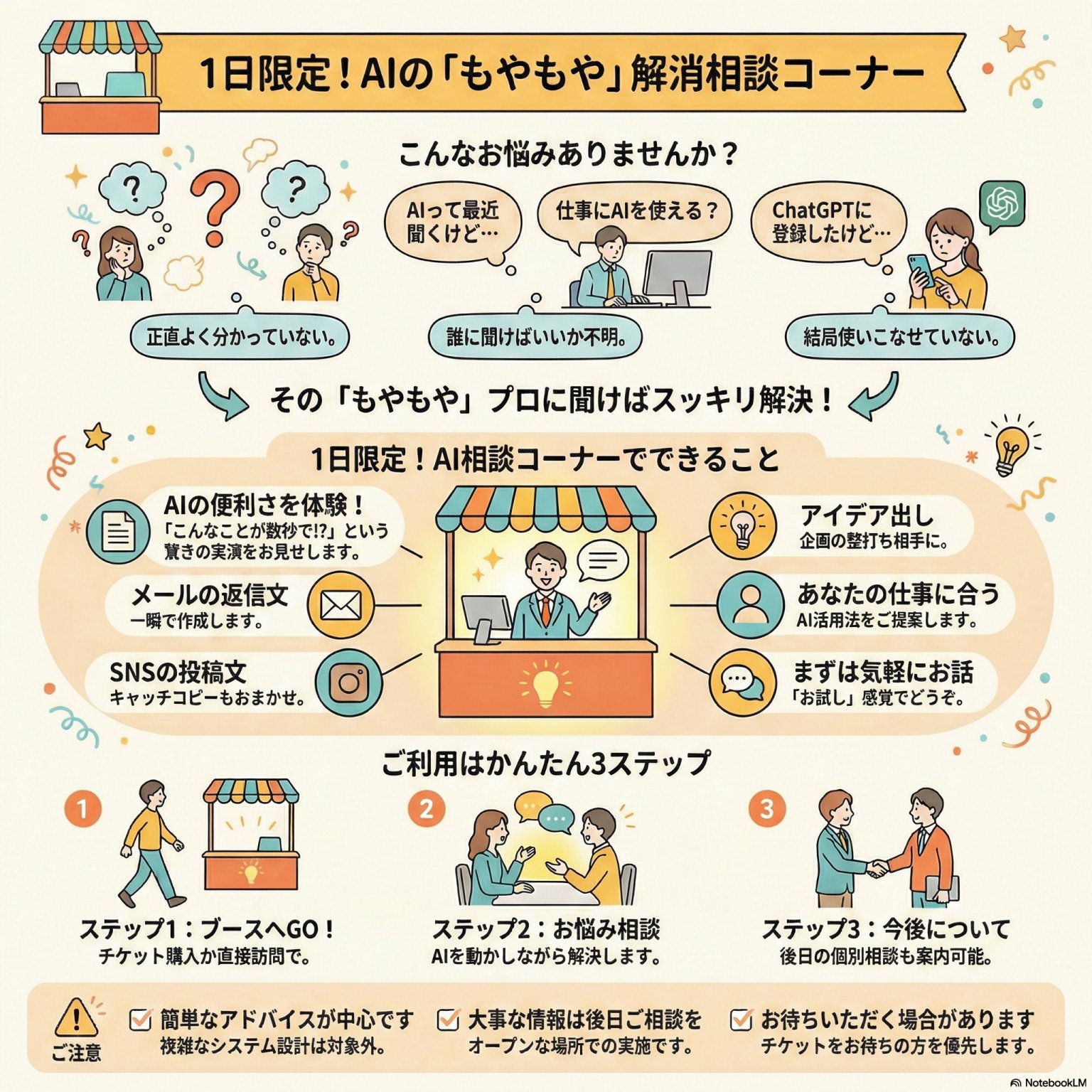 「AIって結局なに?」から「自分の仕事でどう使える?」まで、あなたの疑問にその場でお答えします。
