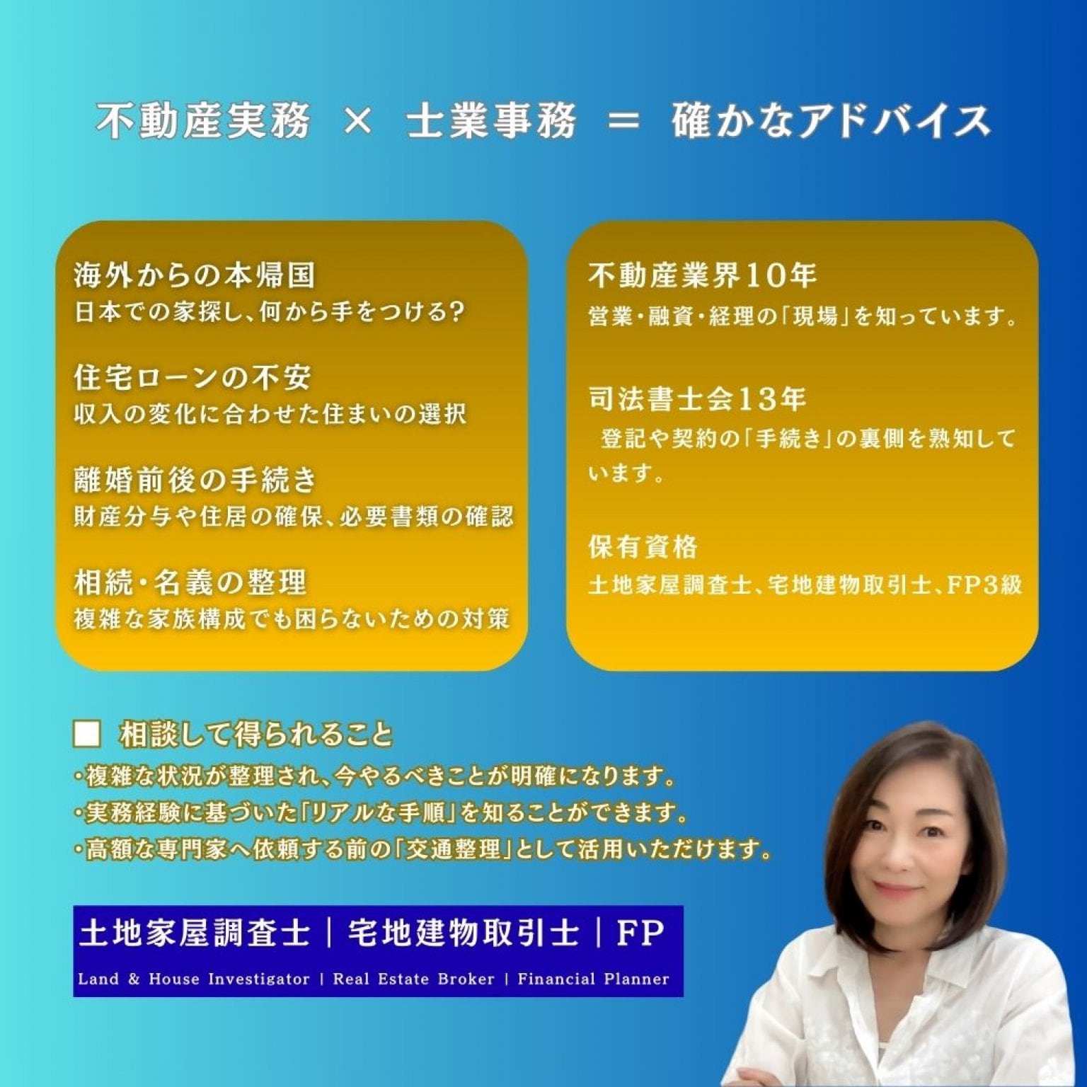 不動産会社で10年 、司法書士会で13年 、現場の最前線で実務に携わってきた経験を活かし、あなたの現状を整理し、解決へのロードマップを提示します。