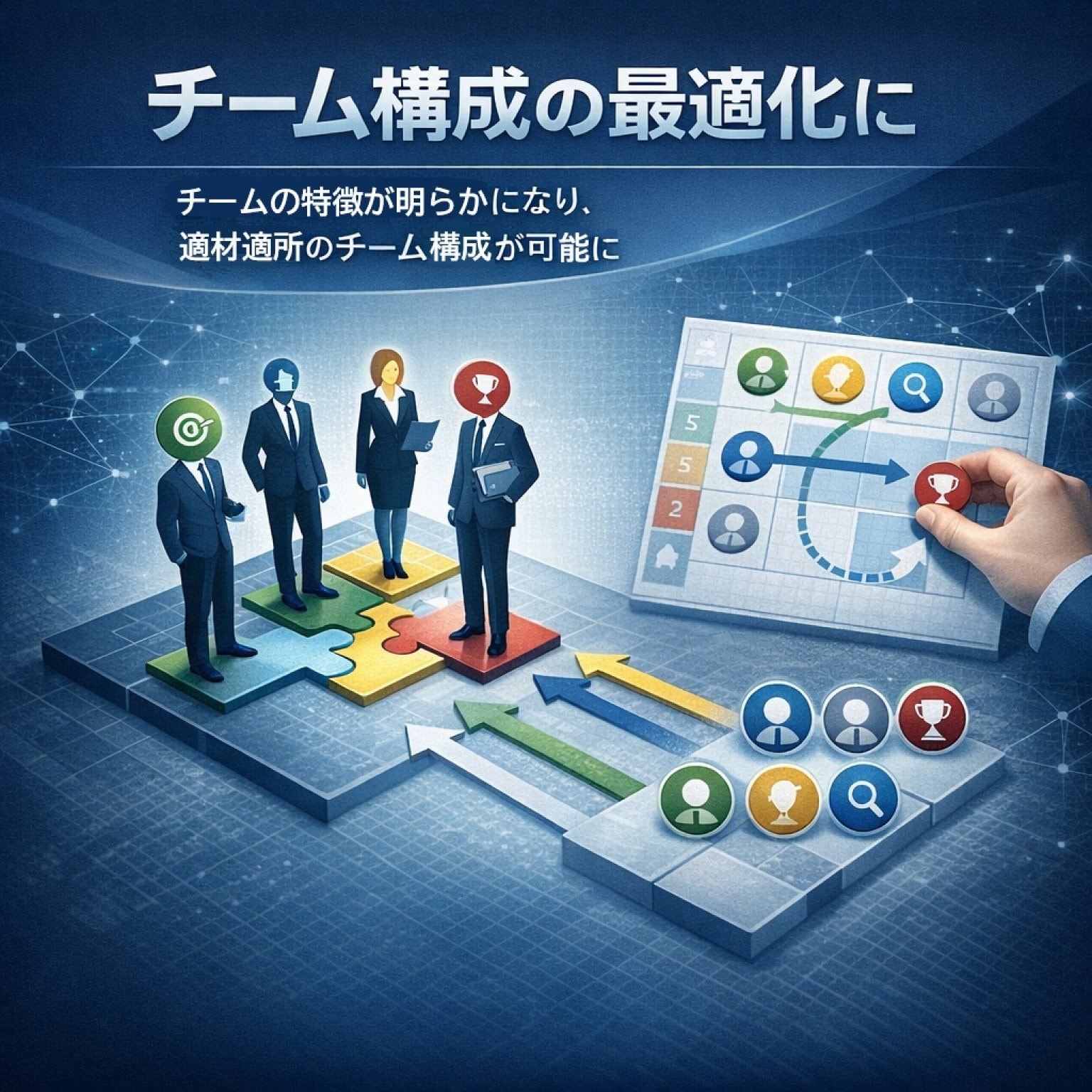 ①チーム構成員の特徴が明らかになり、チーム編成の参考データとして活用できる。