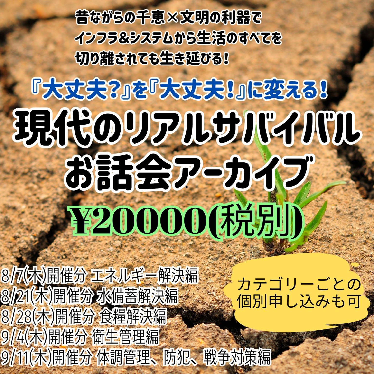今回のお話会は、昔ながらの生活の知恵×現代ならではの文明の利器を使って、備蓄にも頼りつつも備蓄だけに頼らない、長期に渡って生き残るための方法、生活における全てを網羅したお話をさせて頂きます。